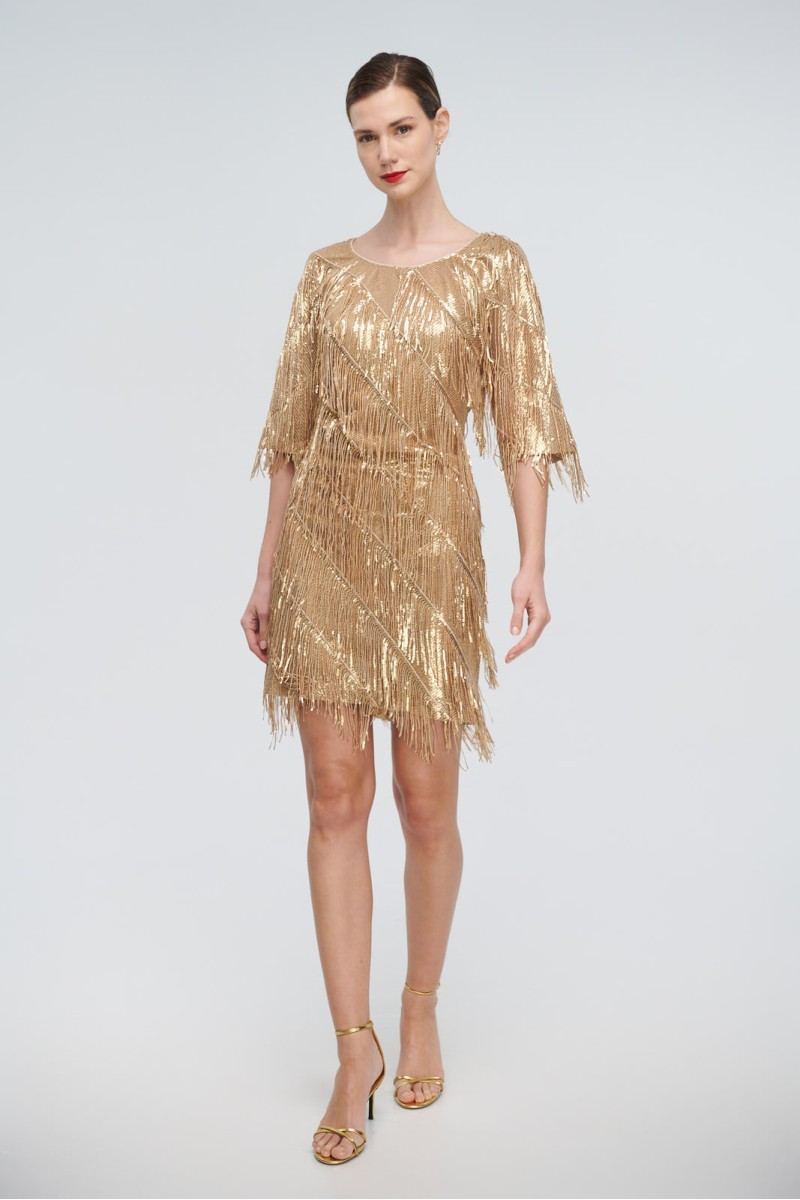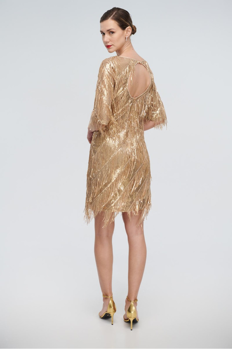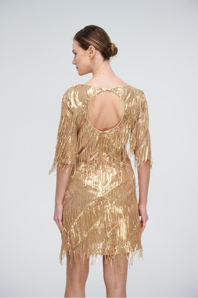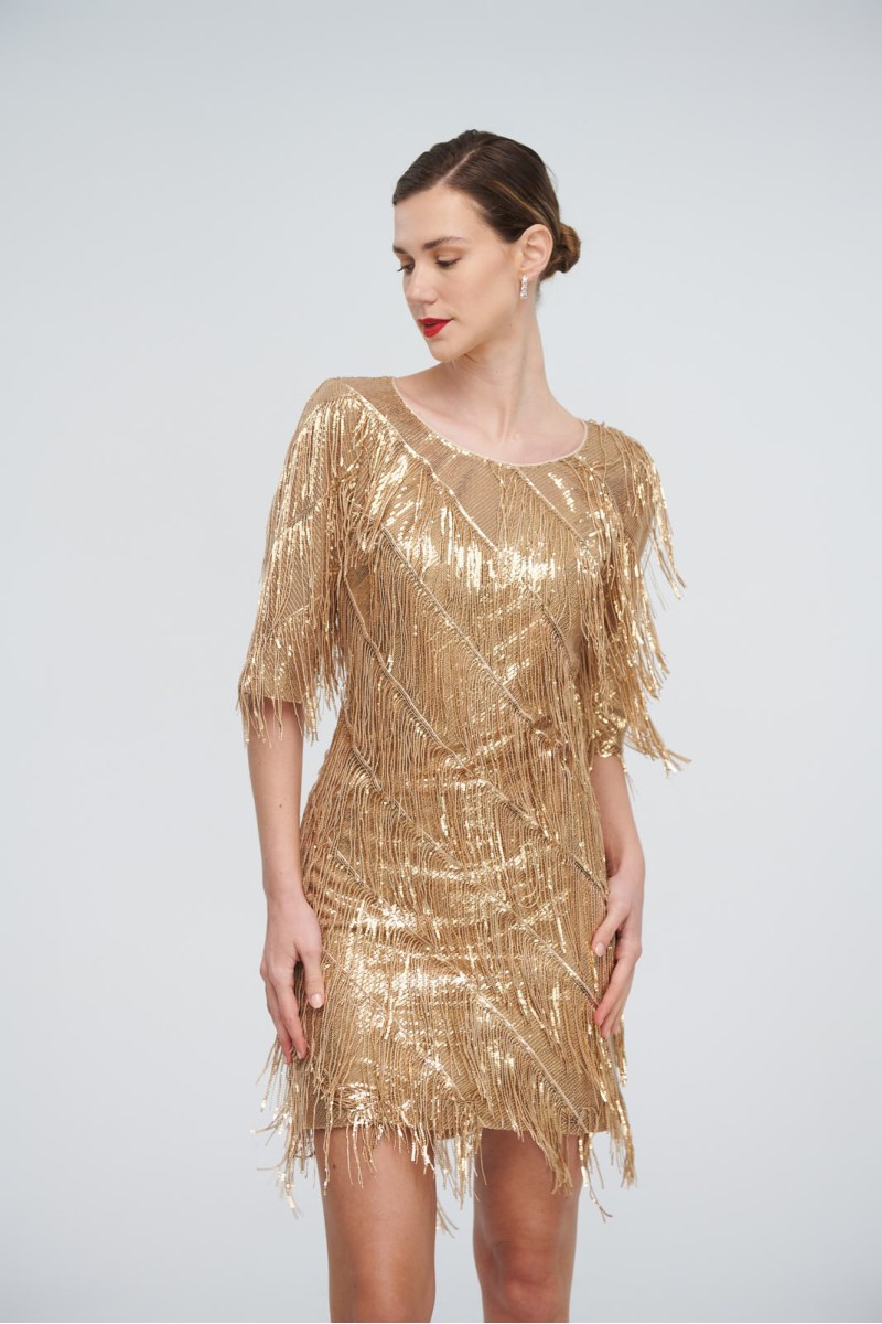 Short dress with fringes and sequins, round neck, back opening in the back, 3/4 sleeve, back closure with hidden zipper in the seam, lined.