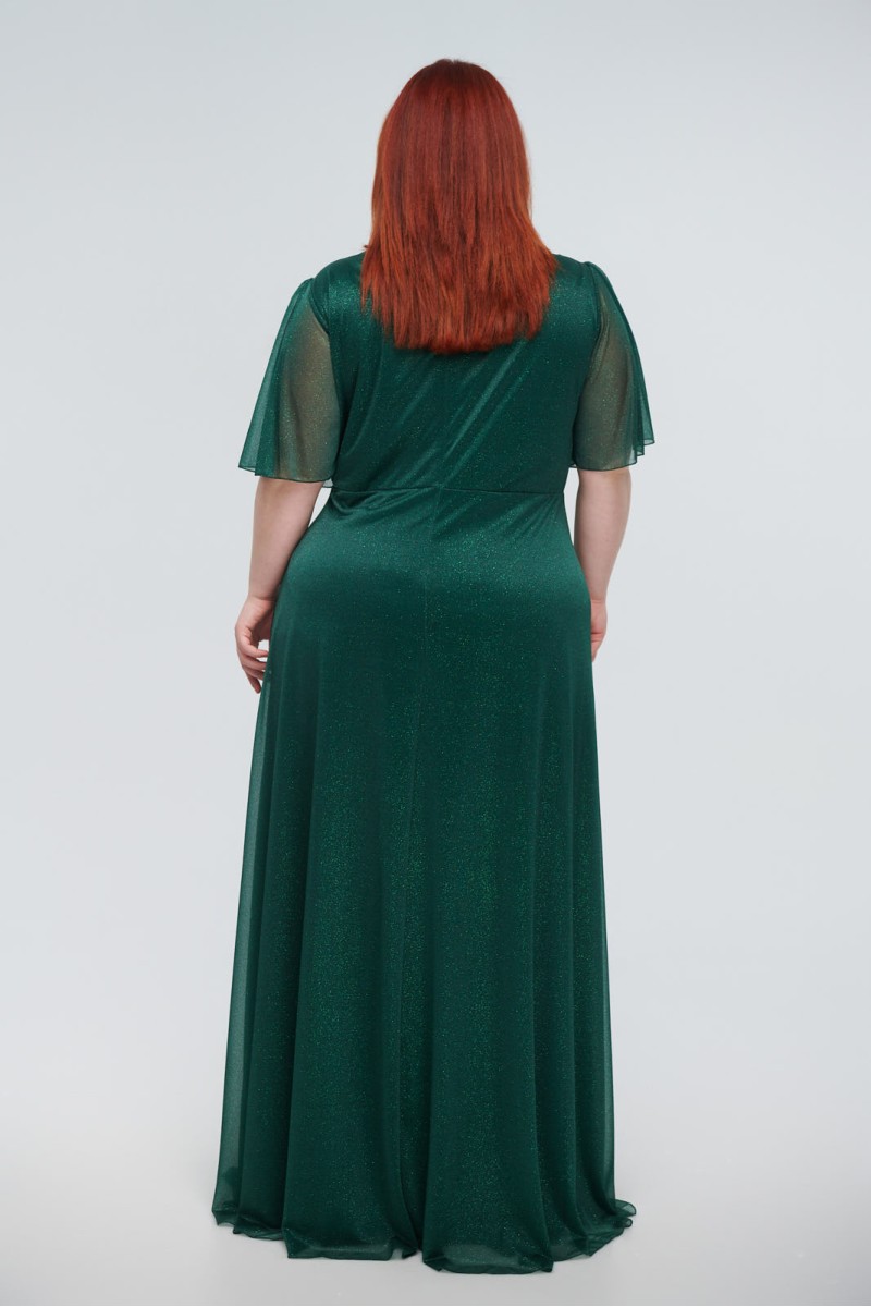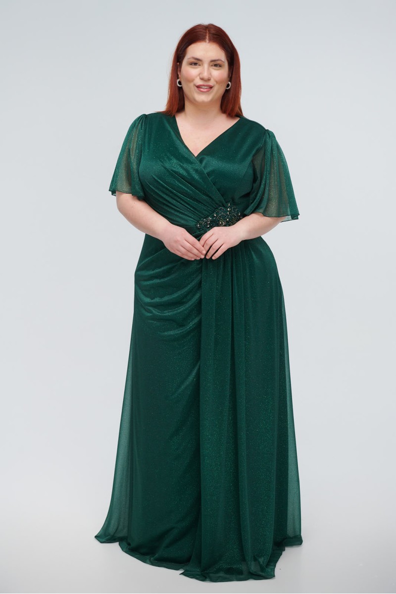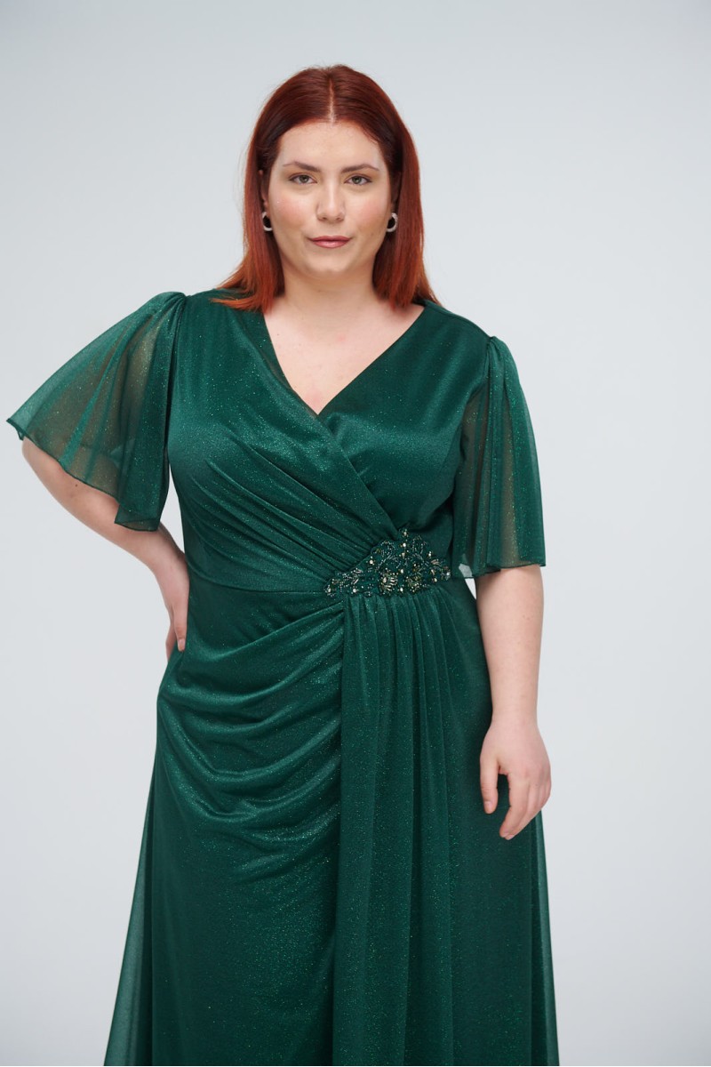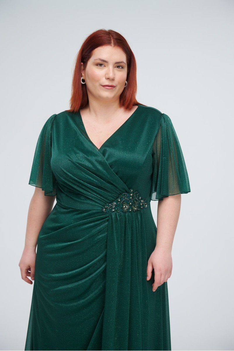 Maxi wrap dress with glitter, reinforced bust, ruffles and embroidery at the waist, short airy sleeves, back closure with hidden zipper at the back, lined.