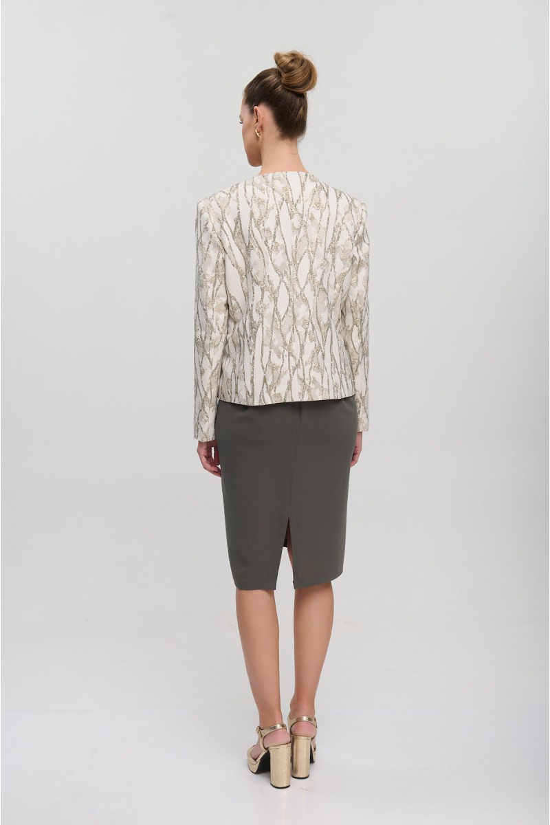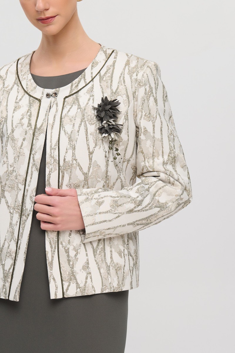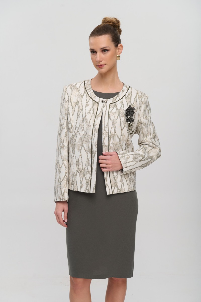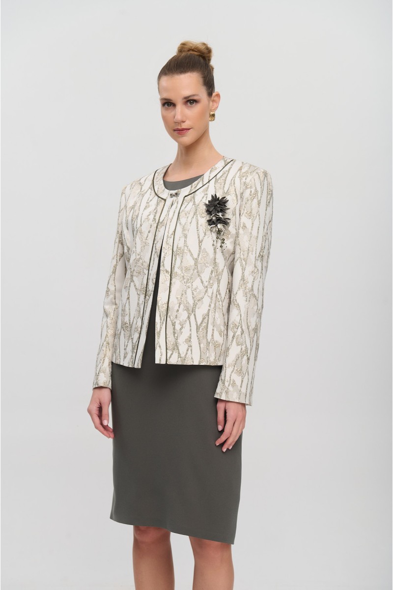 Set consisting of a collarless brocade jacket, lurex in the weave, long sleeves, shoulder pads, lined, detachable decorative brooch, midi crepe short-sleeved dress, opening at the back bottom, back closure with hidden zipper in the seam, lined.