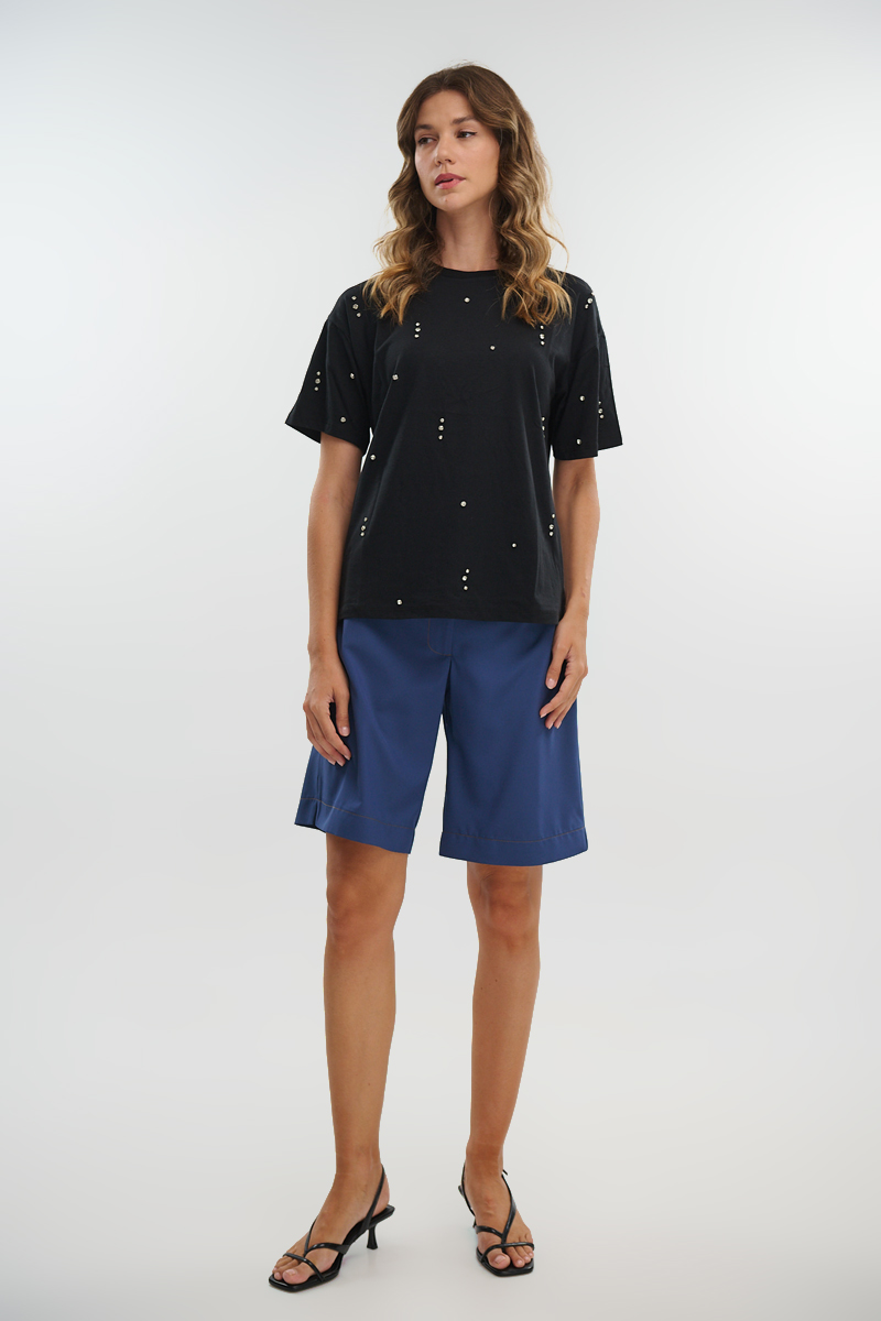 High-waisted shorts, side pockets, front closure with zipper and button.