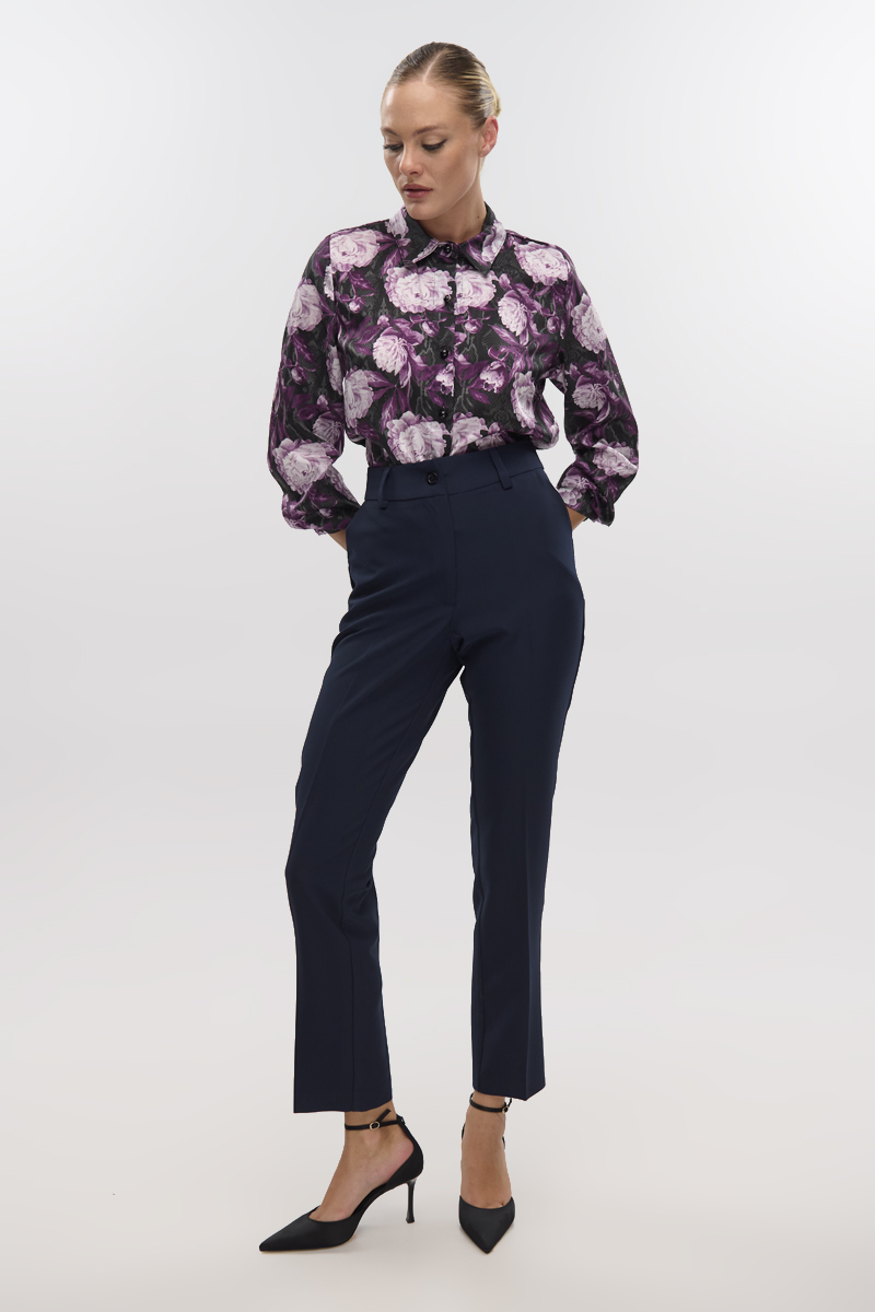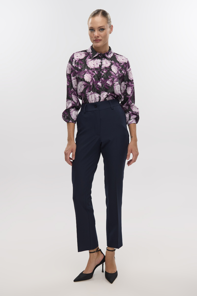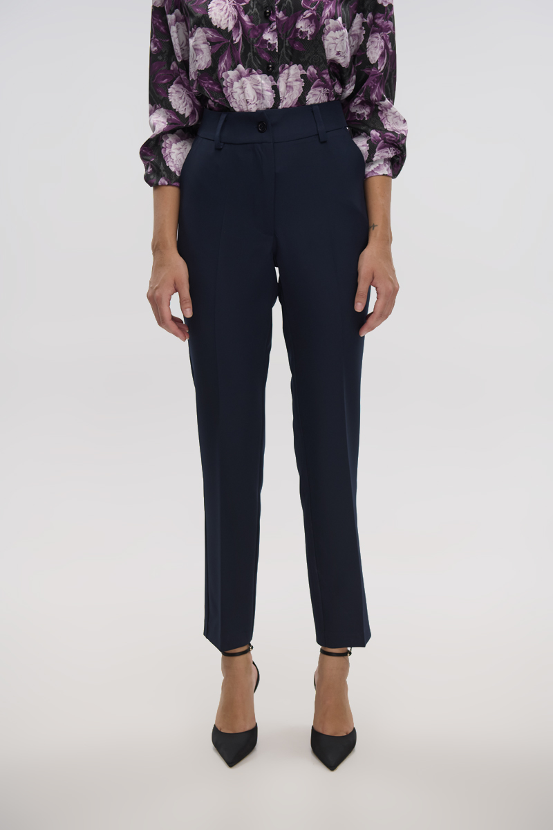 High-waisted crepe pants, front pockets, front closure with zipper and button.