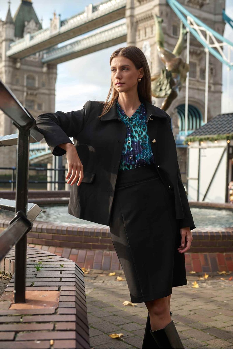High-waisted midi skirt, opening at the back bottom, hidden zipper closure at the back, lined for a better fit.