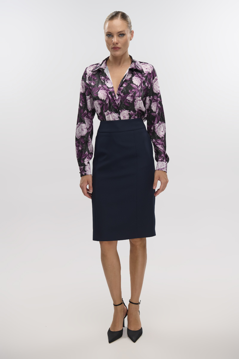 High-waisted midi skirt, opening at the back bottom, hidden zipper closure at the back, lined for a better fit.