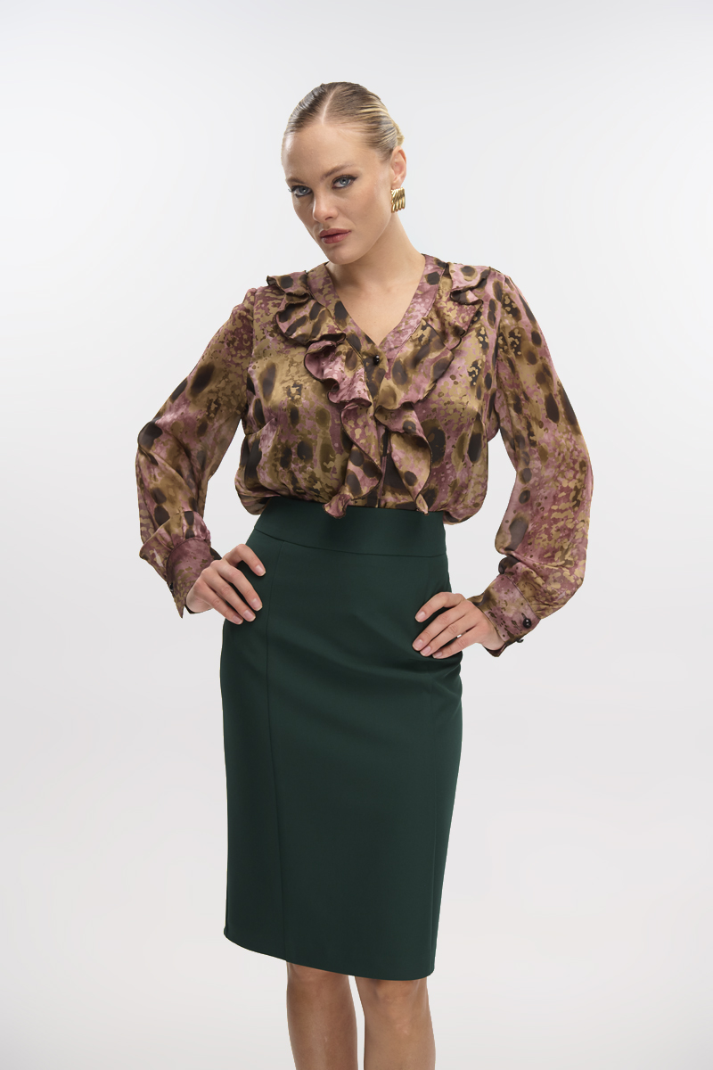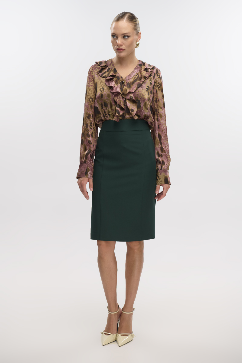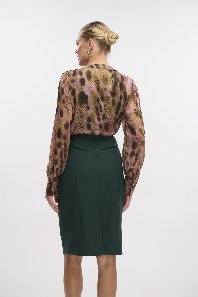 High-waisted midi skirt, opening at the back bottom, hidden zipper closure at the back, lined for a better fit.