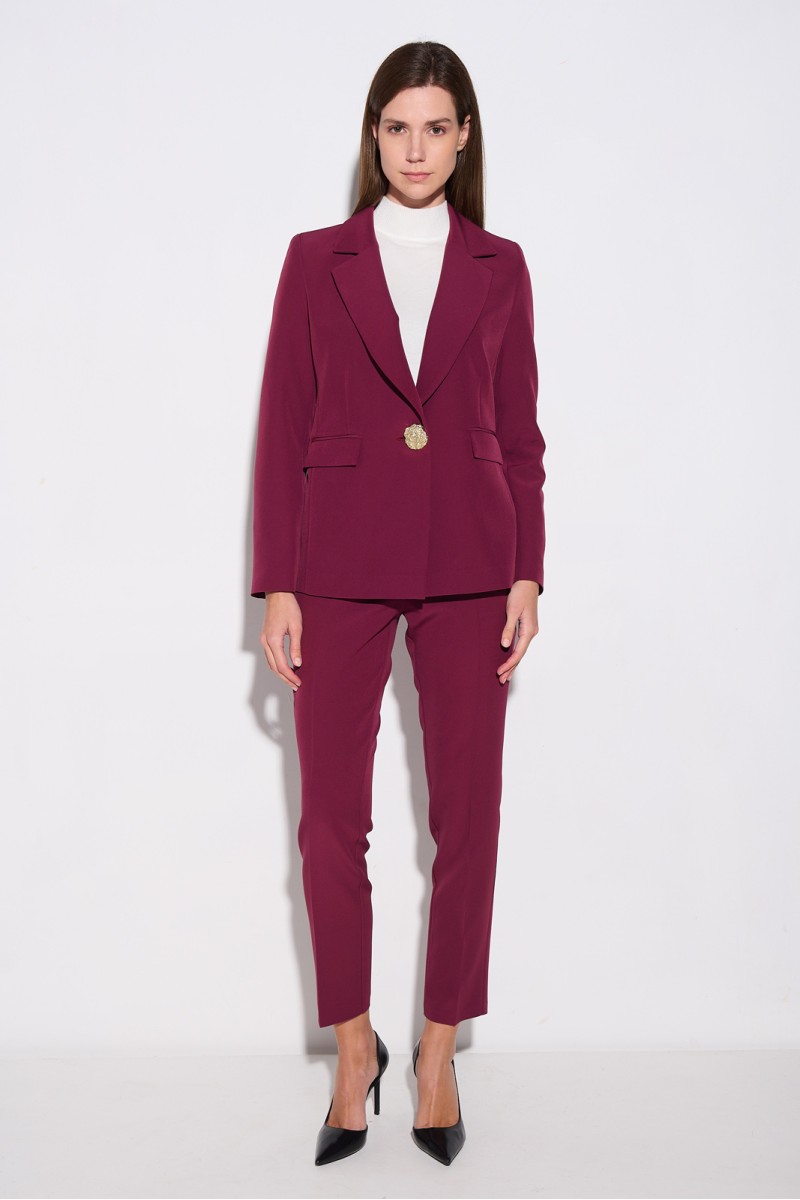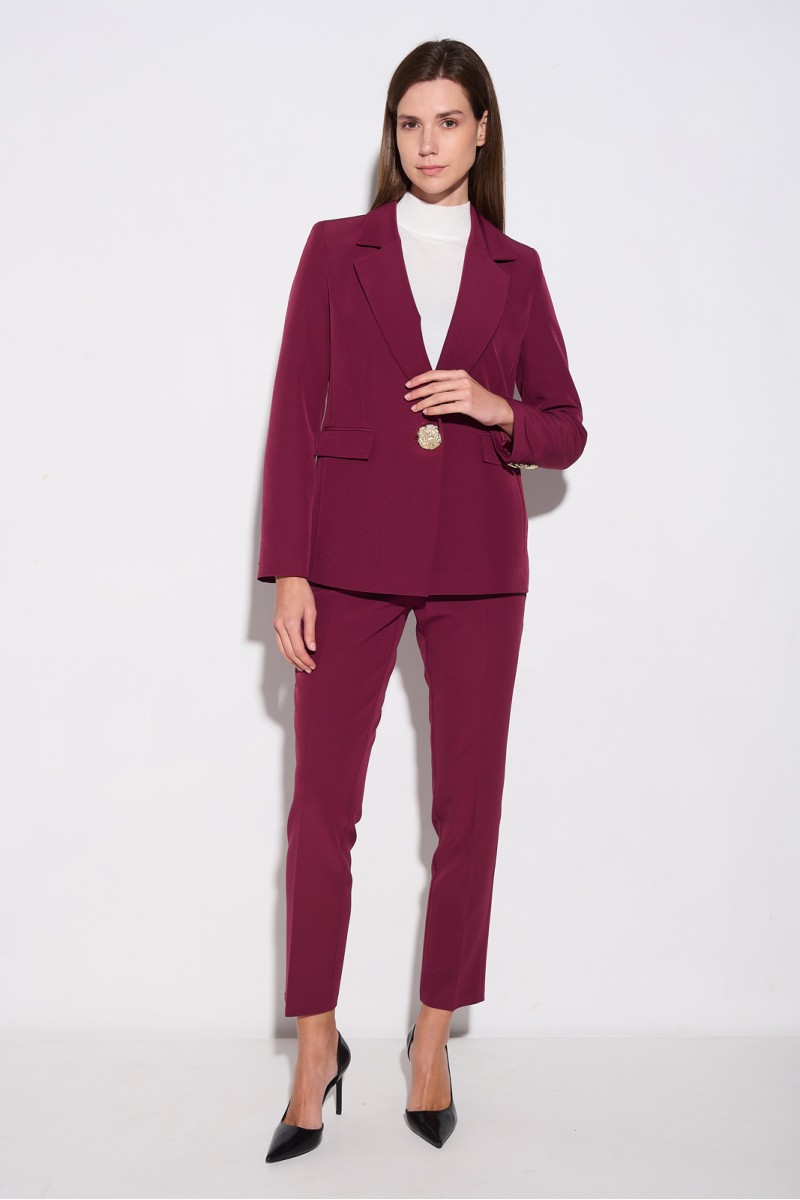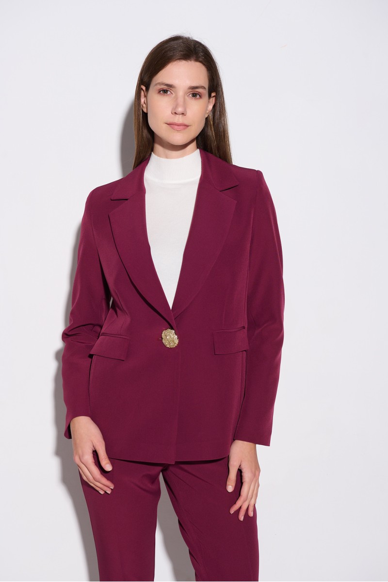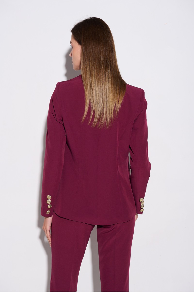 Crepe jacket with lapel collar, shoulder pads, long sleeves with decorative buttons at the hem, flap pockets at the front, gold button closure, lined.