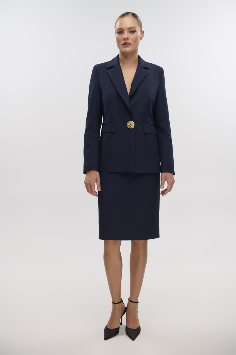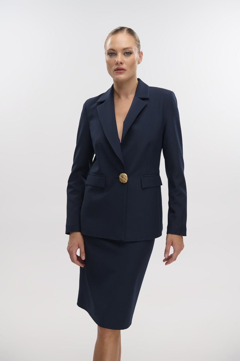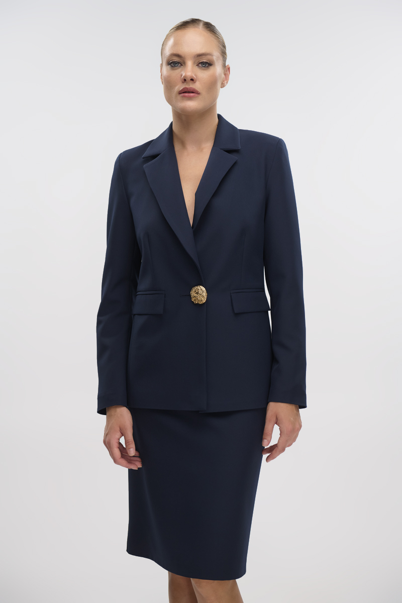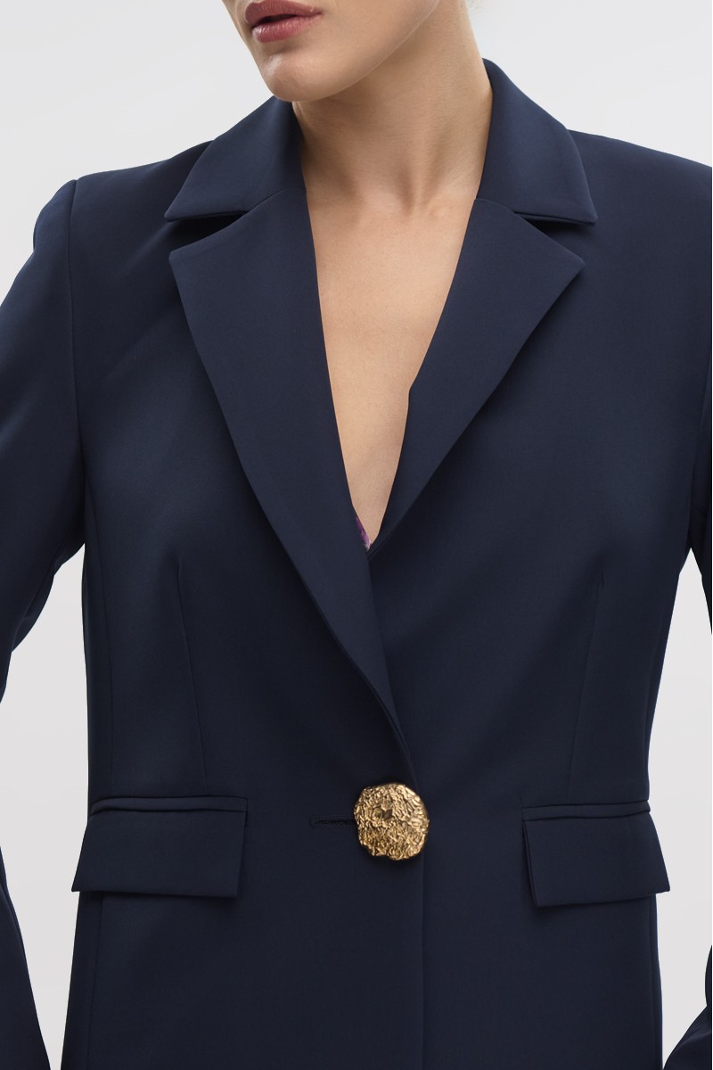 Crepe jacket with lapel collar, shoulder pads, long sleeves with decorative buttons at the hem, flap pockets at the front, gold button closure, lined.