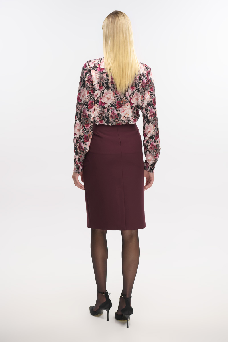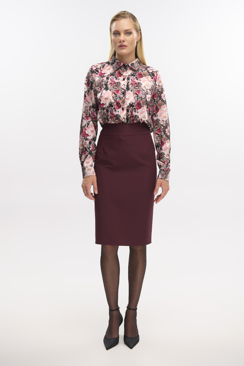 High-waisted midi skirt, back closure with hidden zipper in the seam, opening at the back bottom, lined for a better fit.