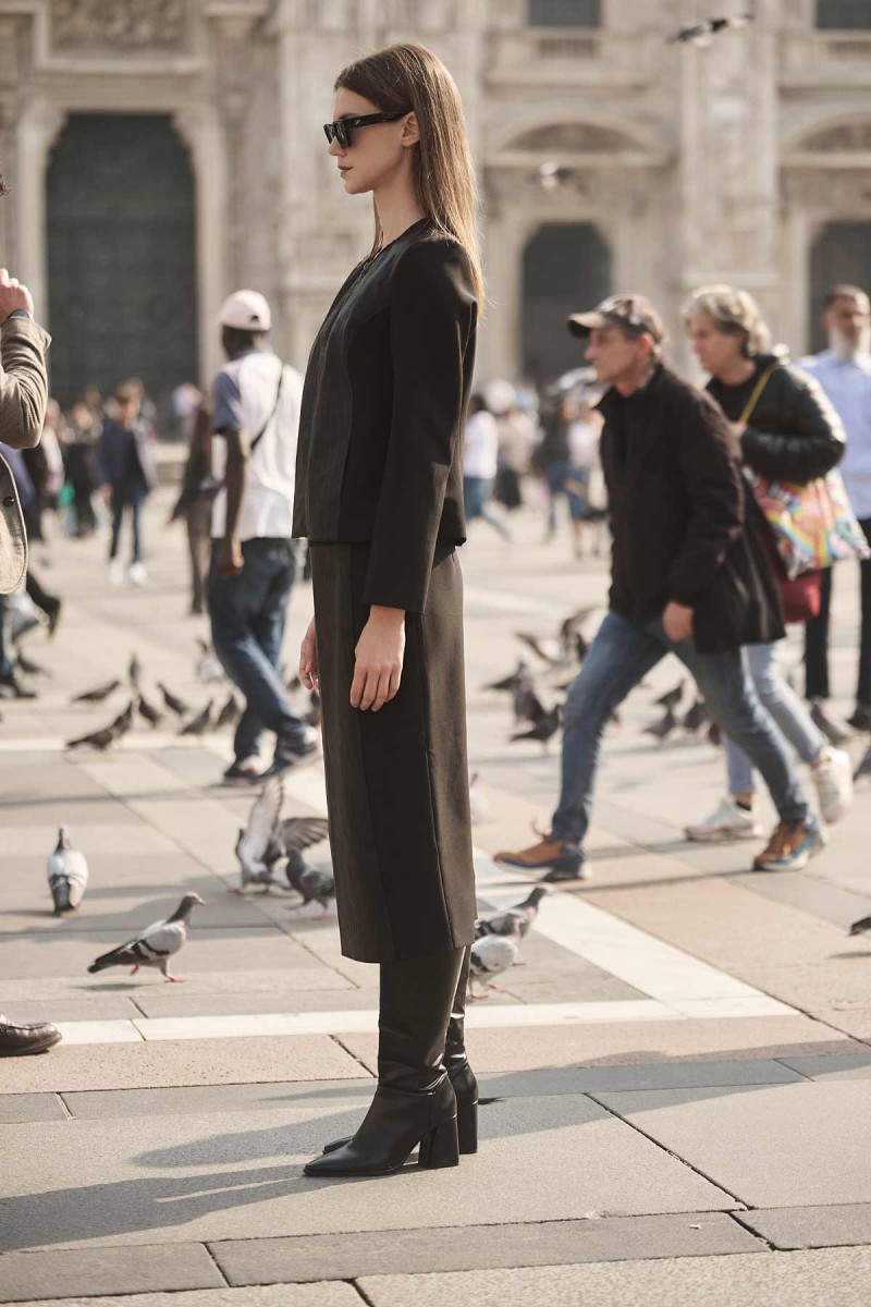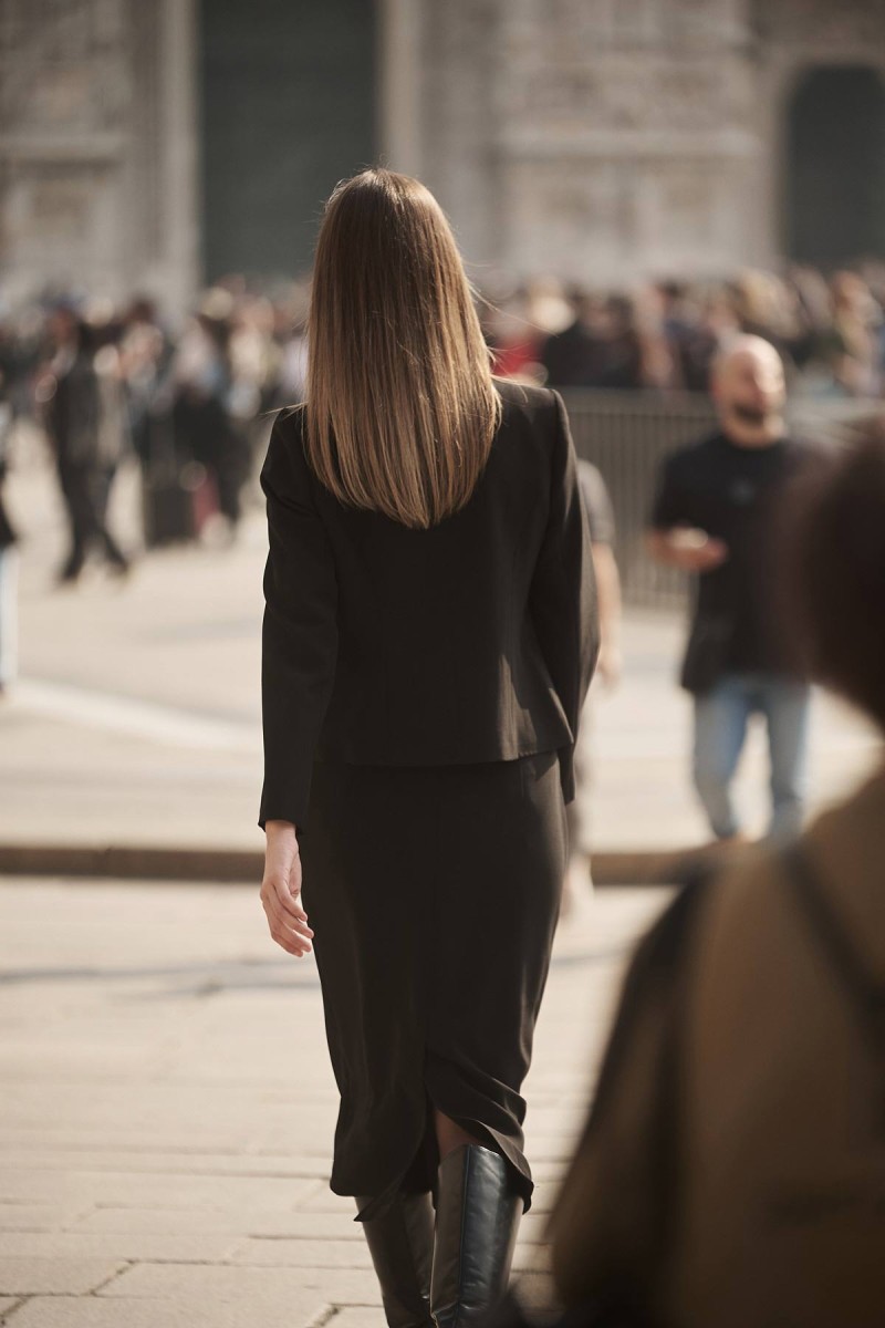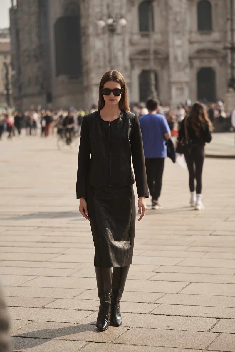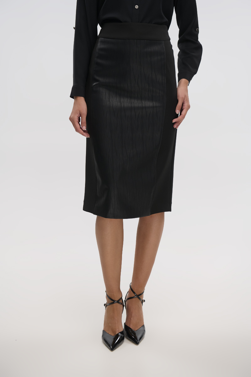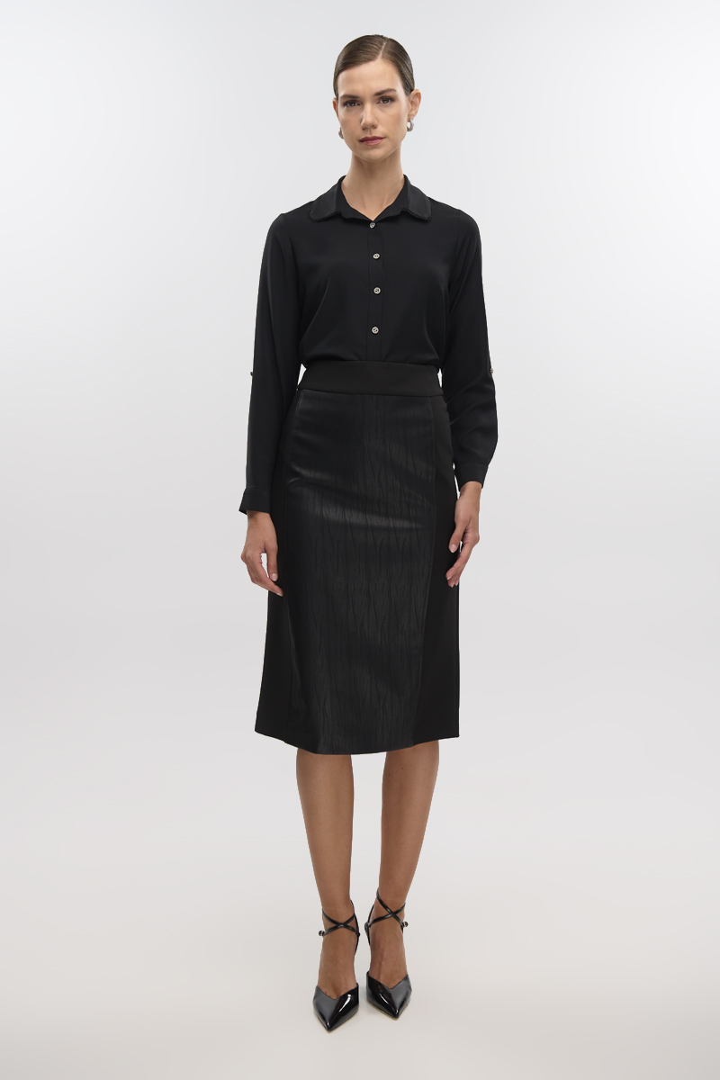 Crepe high-waisted midi skirt with leatherette front, back closure with hidden zipper in the seam, opening at the back bottom, lined.