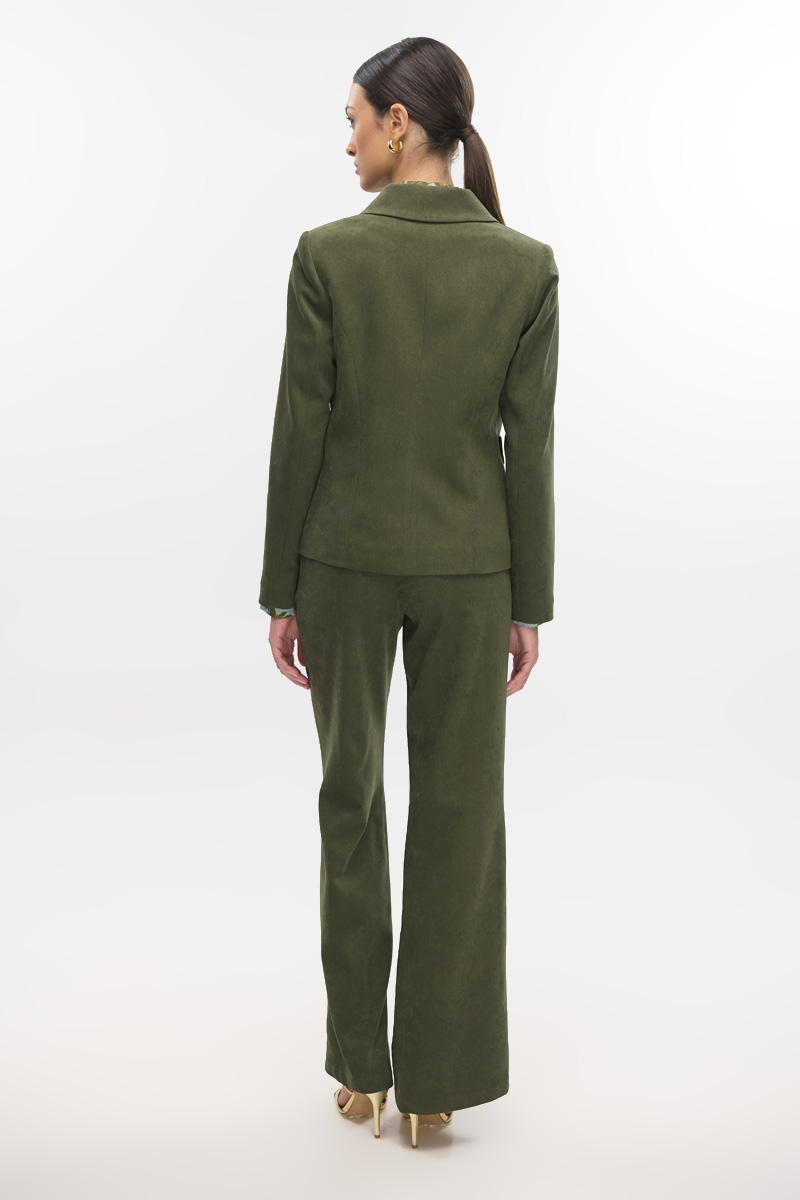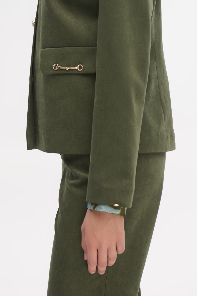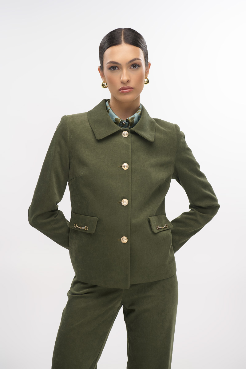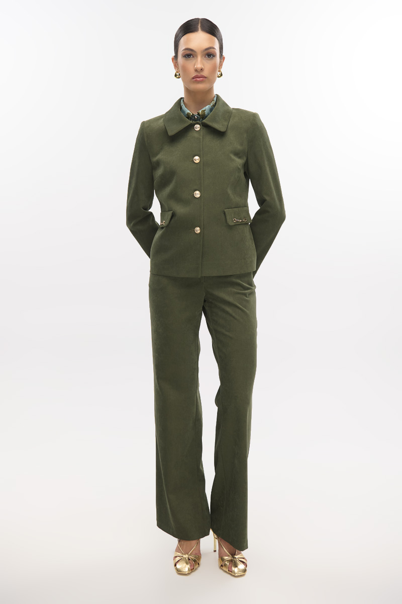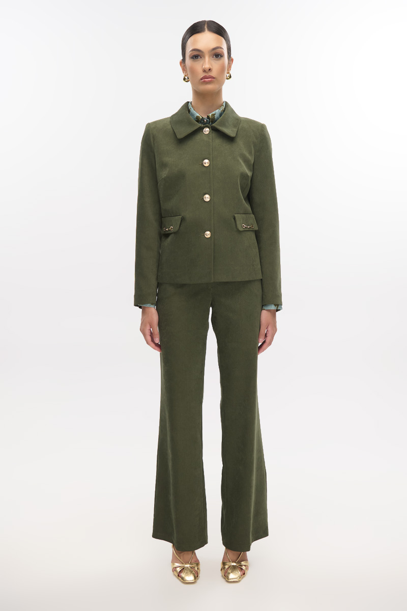 Corduroy jacket with collar, shoulder pads, long sleeves, decorative flap pockets and chain, front closure with gold buttons, lined.
