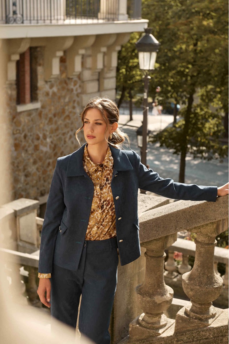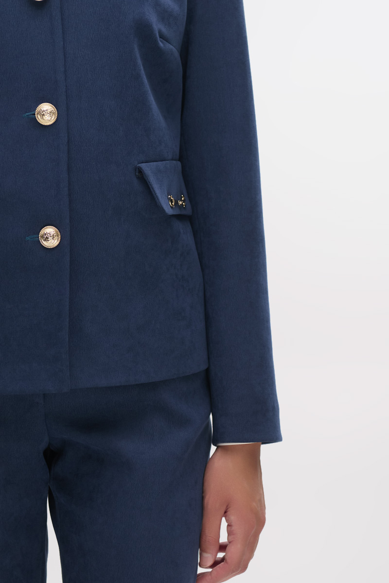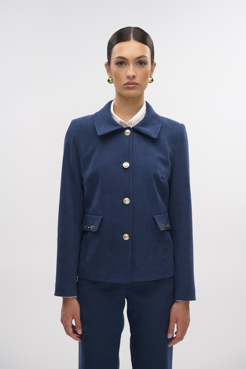 Corduroy jacket with collar, shoulder pads, long sleeves, decorative flap pockets and chain, front closure with gold buttons, lined.