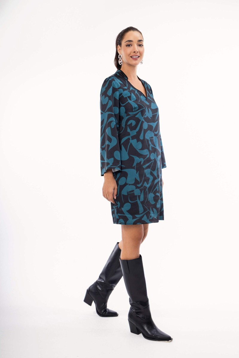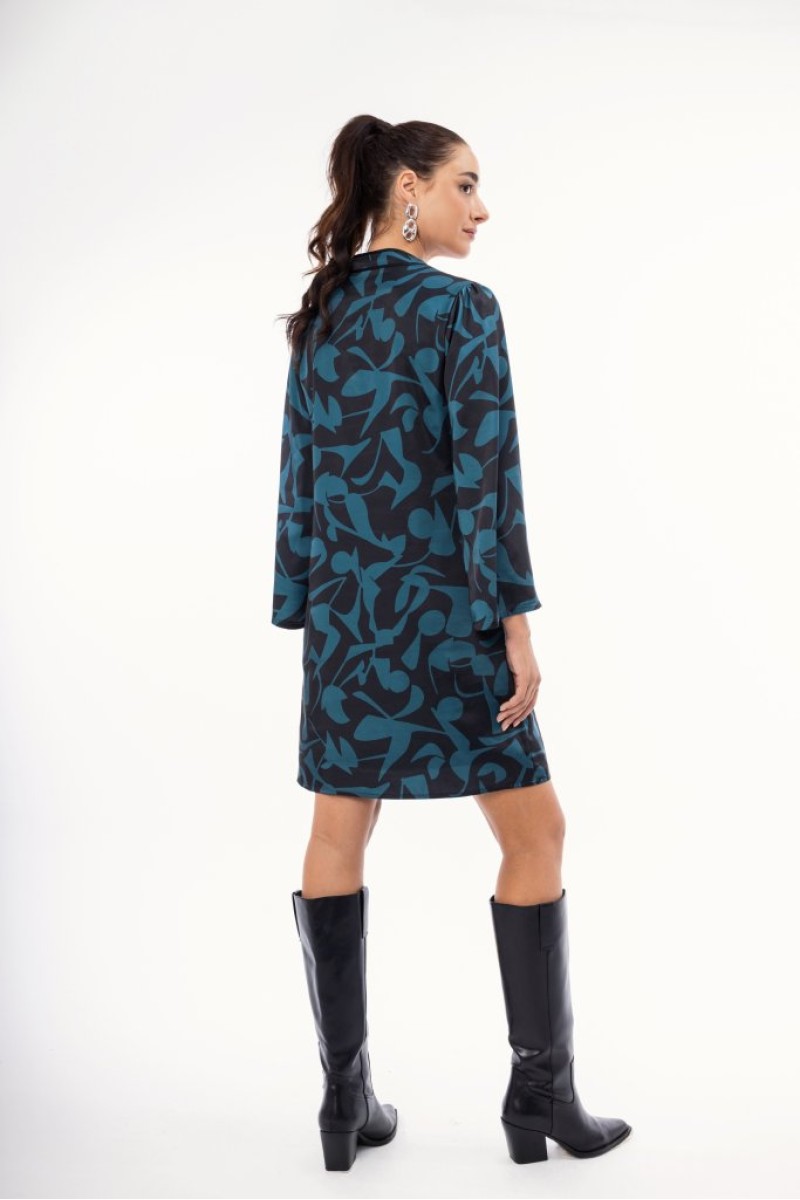 Midi satin dress with a special collar and V opening, long bell sleeves, lined.
