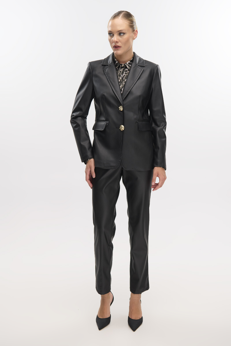 Leatherette jacket with lapel collar, shoulder pads, long sleeves with decorative button at the hem, flap pockets at the front, button closure, lined.