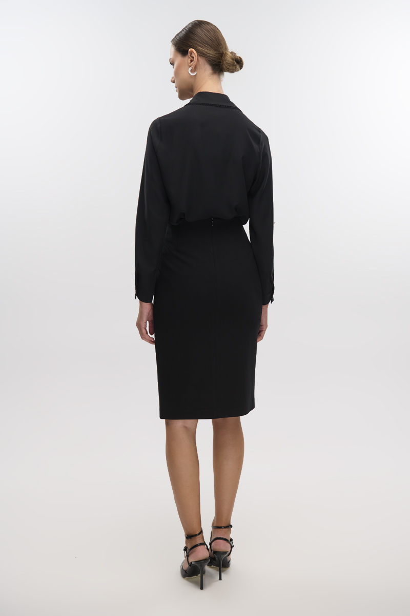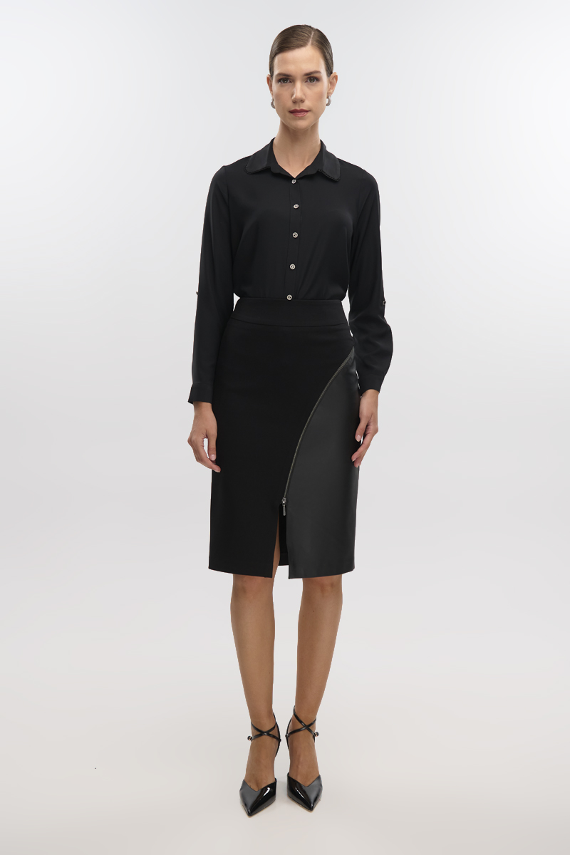 High-waisted midi skirt with leatherette and front zipper, back closure with hidden zipper in the seam, front opening, lined.
