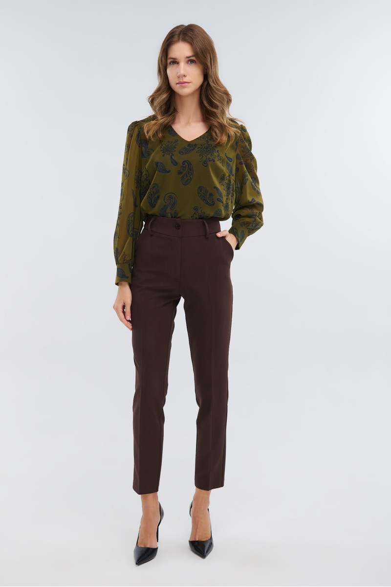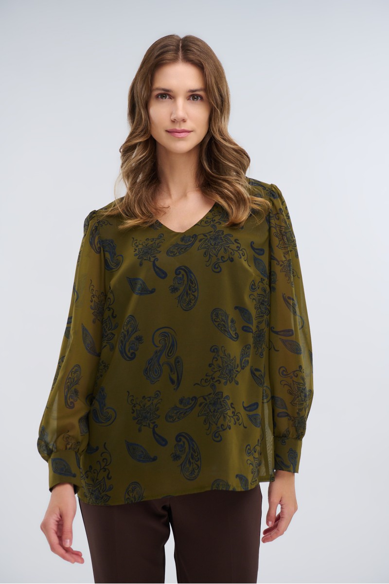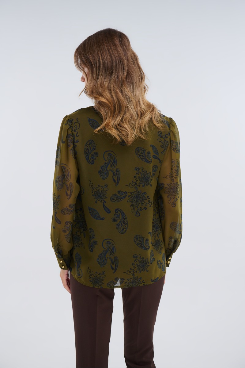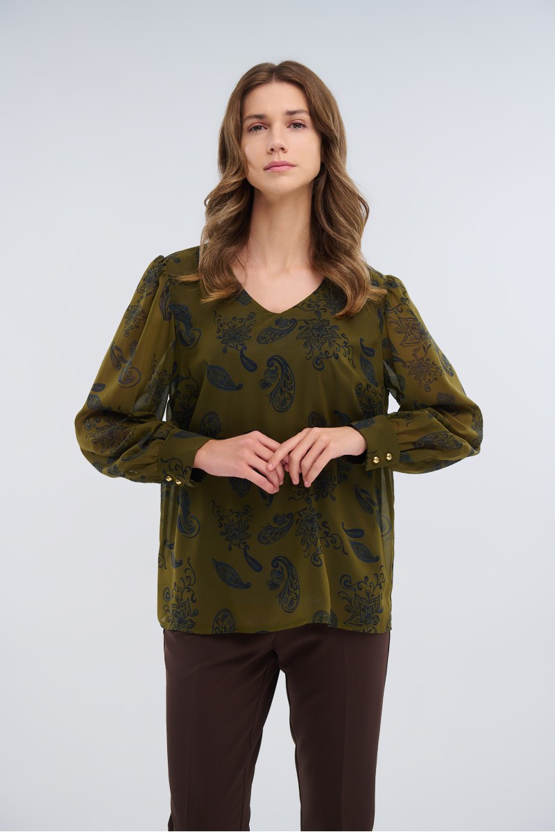 Lahouri muslin blouse with V opening, long sleeves with transparency and cuffs with buttons at the end, lined.