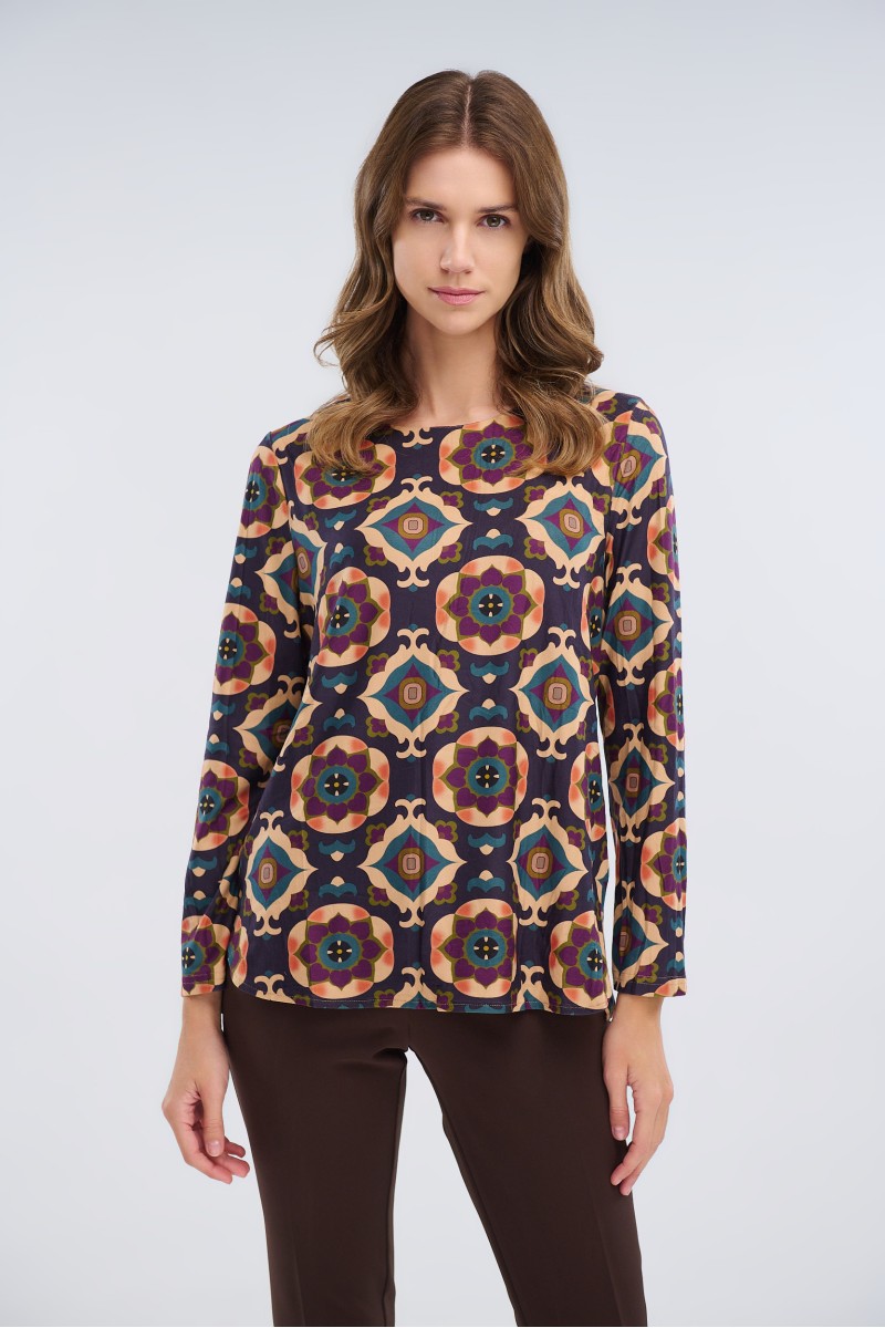 Printed elastic blouse with round neckline, long sleeves, side slits.