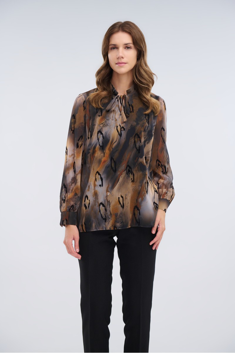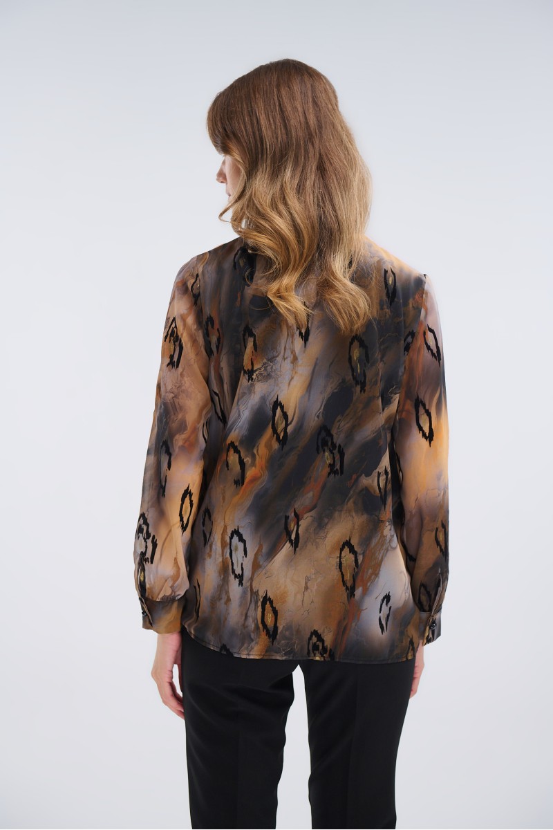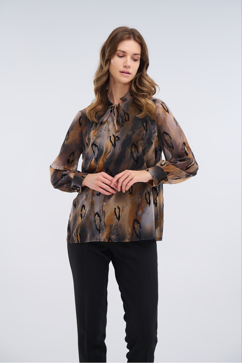 Printed muslin blouse with collar, V-neck with laces, long sleeves with cuffs and button, lined.