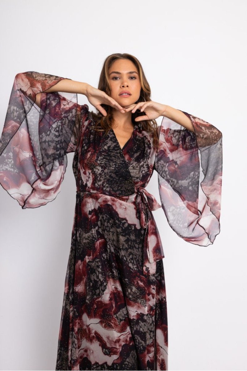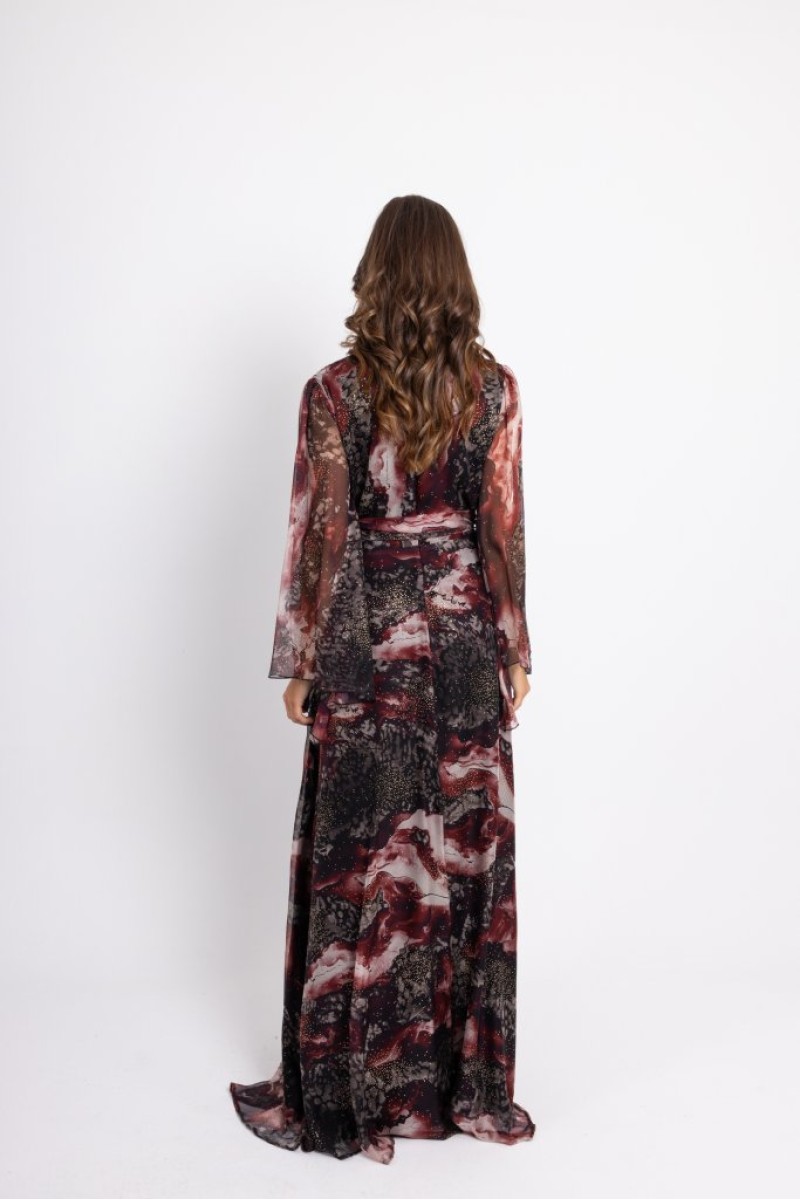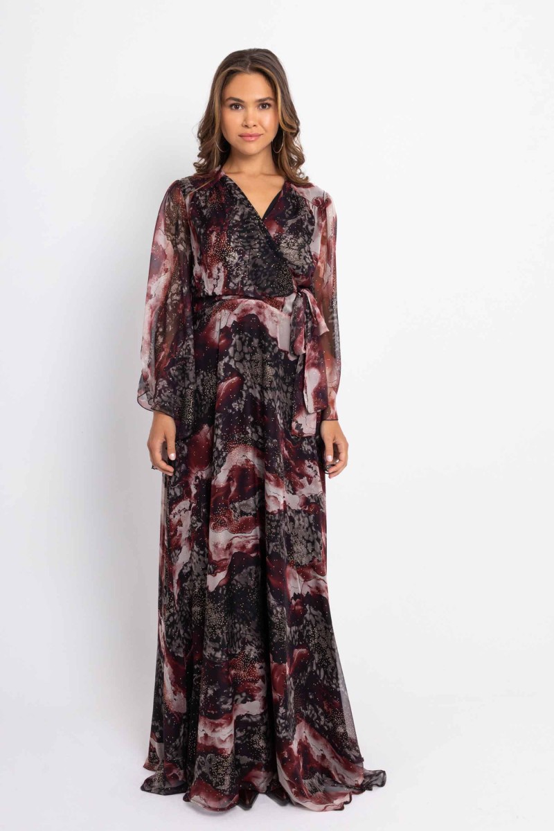 Maxi printed wrap dress with gold details, side ties, long bell sleeves, back closure with hidden zipper at the seam, lined.