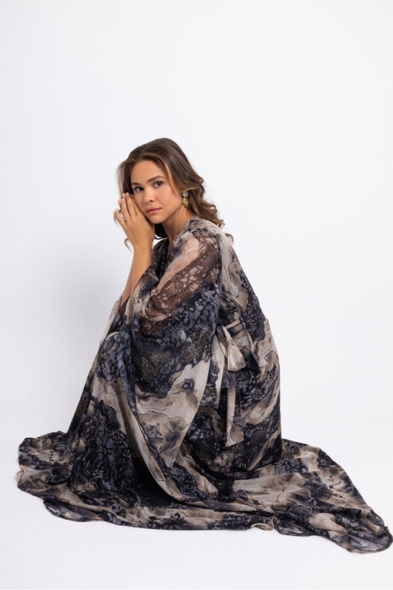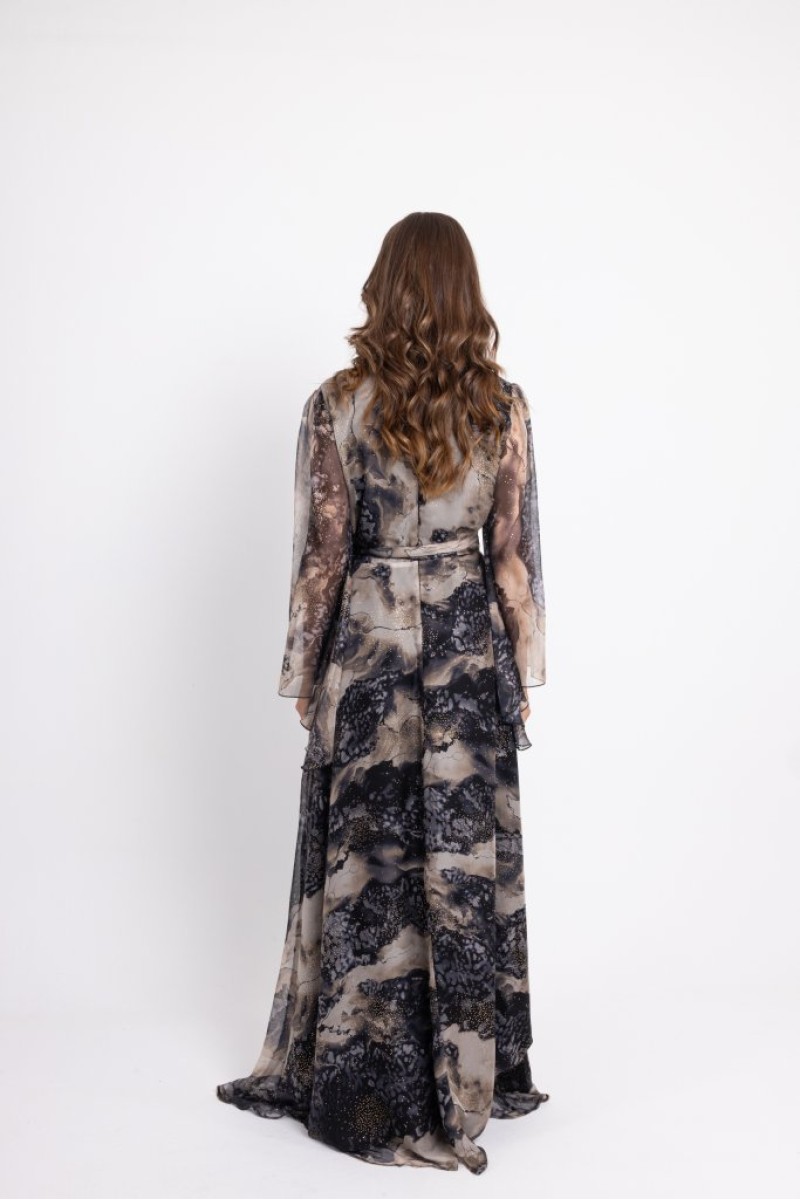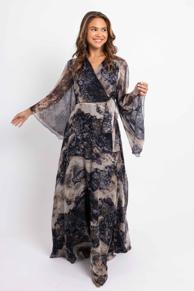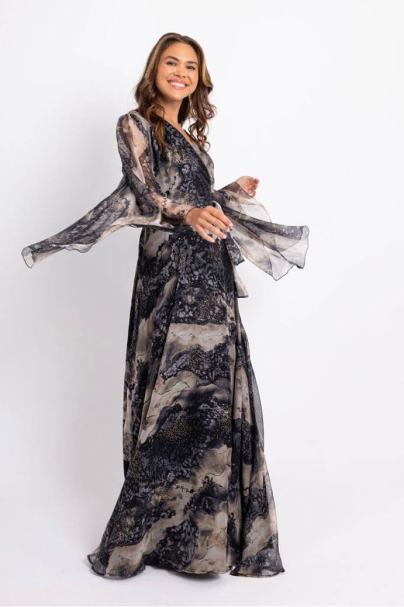Maxi printed wrap dress with gold details, side ties, long bell sleeves, back closure with hidden zipper at the seam, lined.