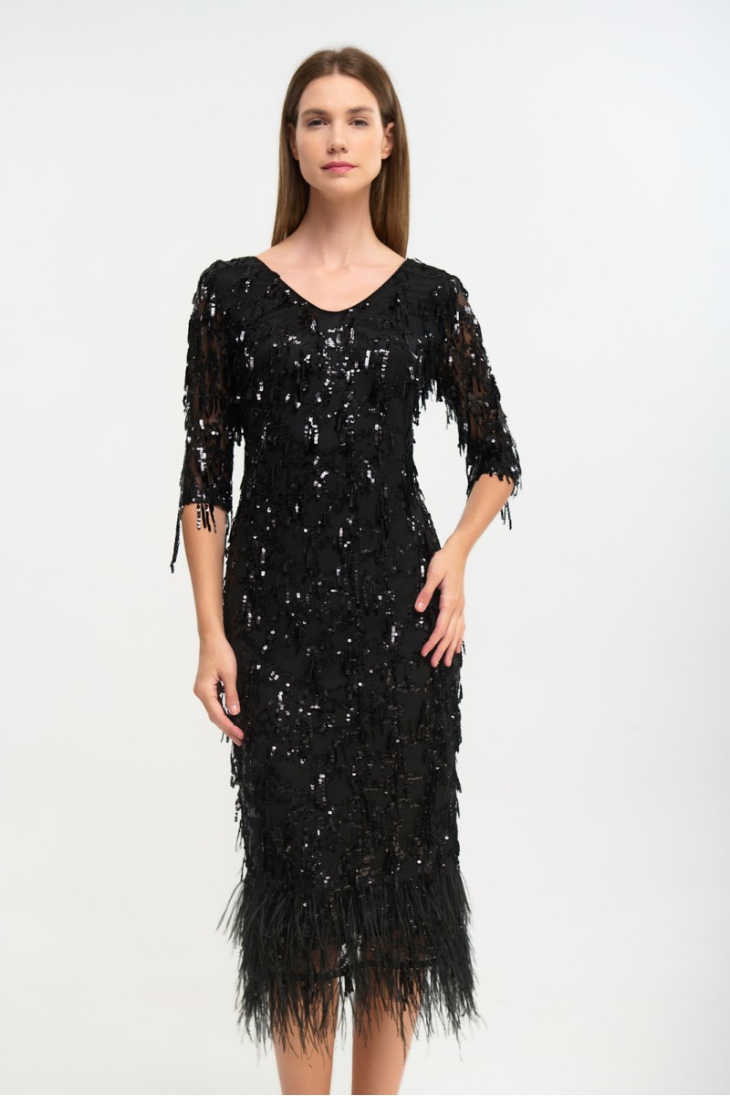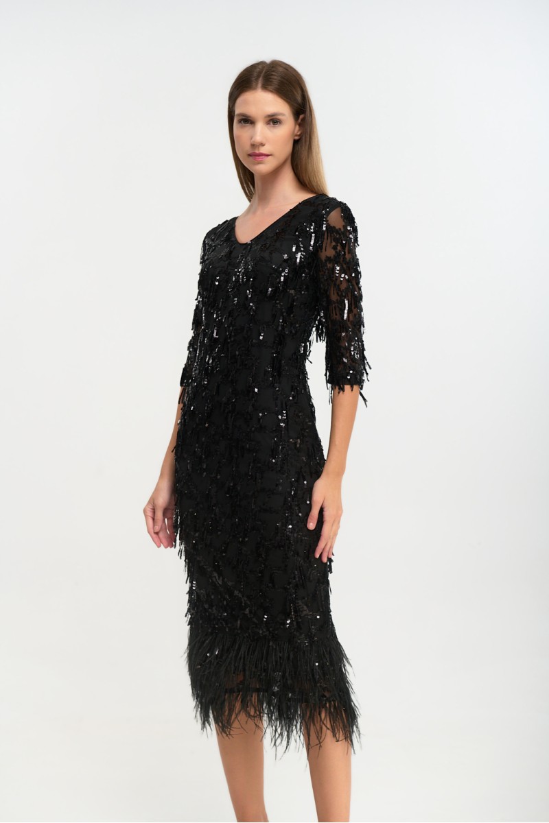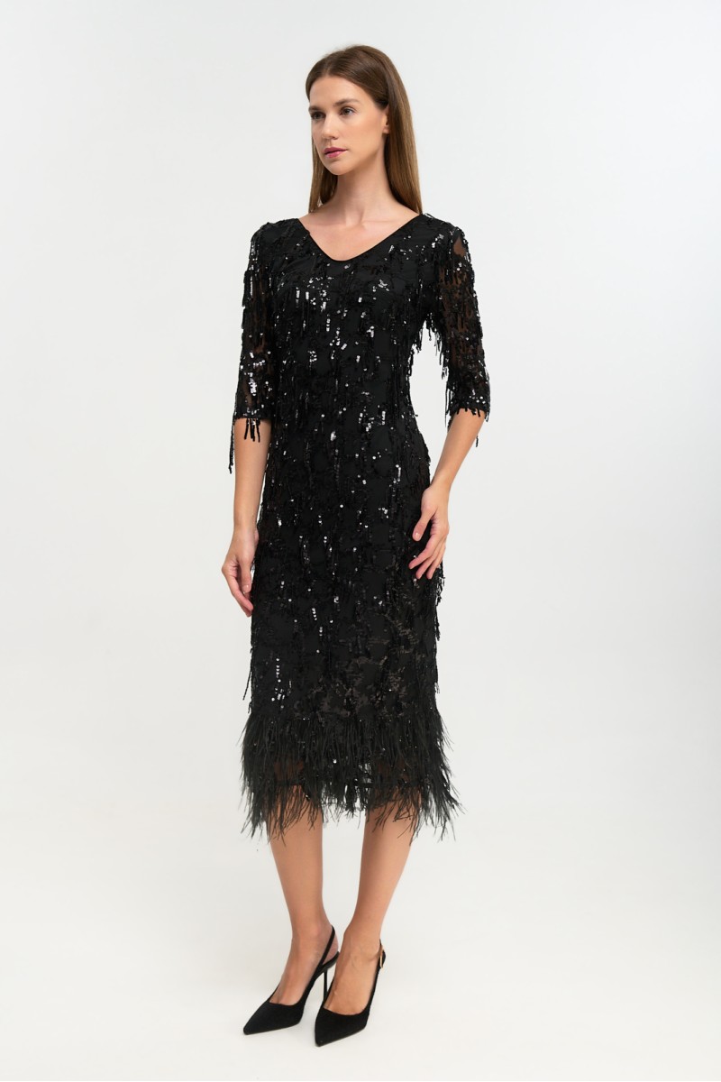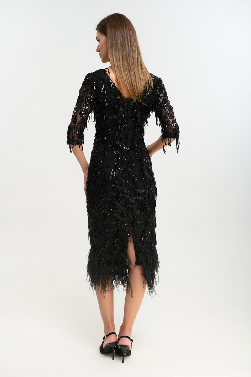 Embroidered tulle dress with fringes and sequins, feathers at the hem, 3/4 sleeves, back closure with hidden zipper, opening at the back bottom, lined.