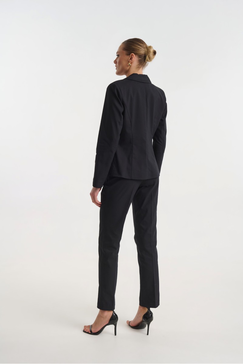 High-waisted crepe pants, front pockets, front closure with zipper and button.