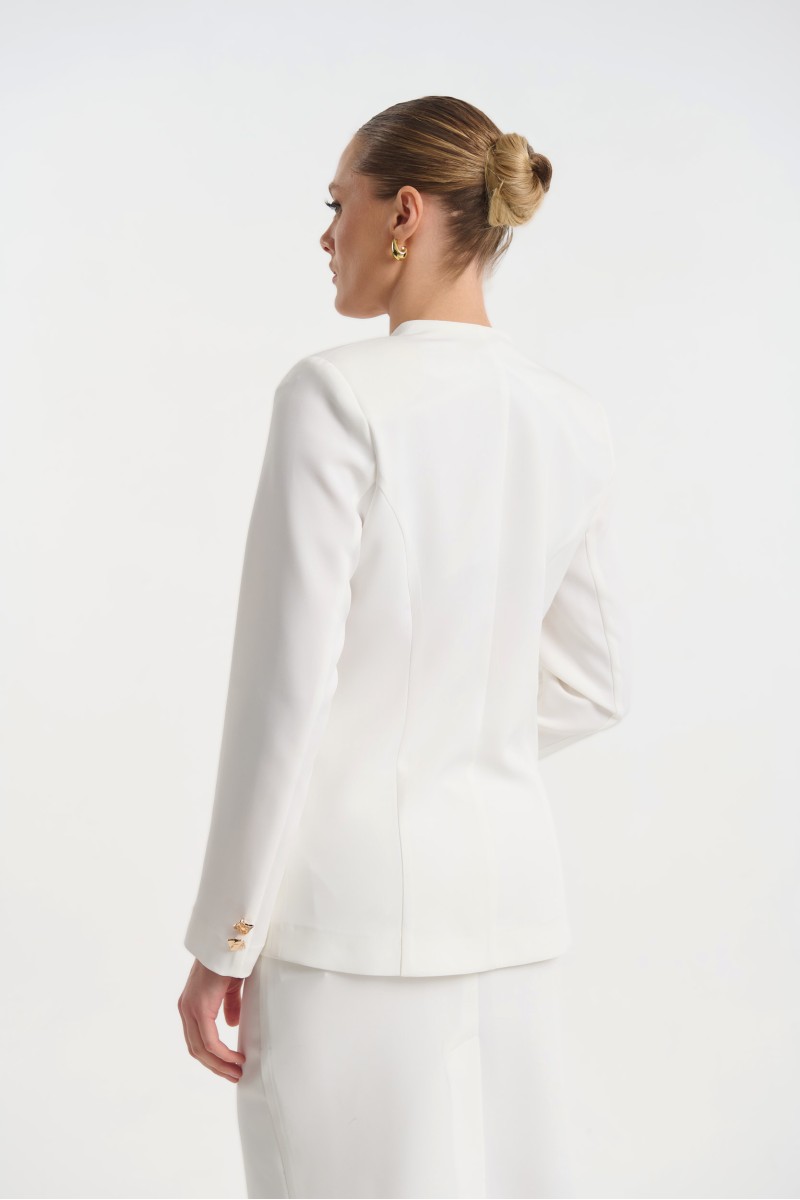 Collarless blazer with shoulder pads, front flap pockets, front gold button fastening. Partially lined at the front.