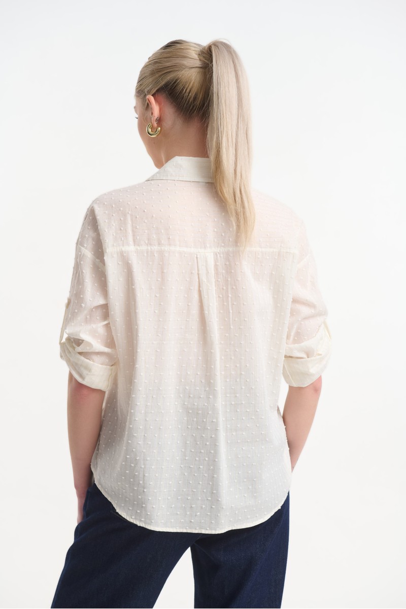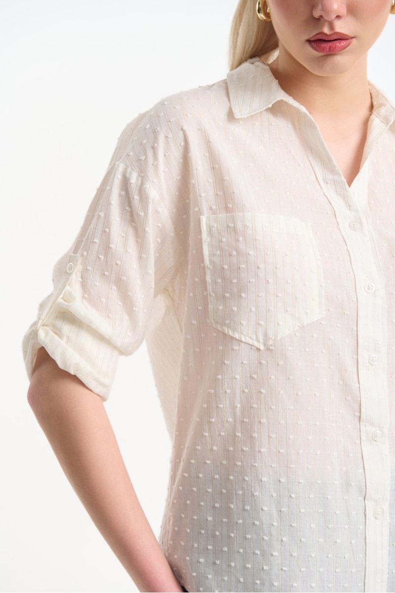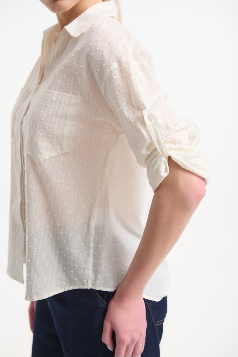 Long-sleeve shirt with a striped pattern made from gold thread. Features two front chest pockets and a button-down front closure. The sleeves have buttoned cuffs and an additional button at elbow height, allowing the sleeves to be rolled up and fastened into a 3/4 length.