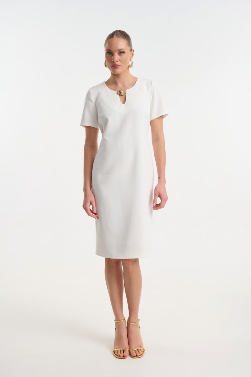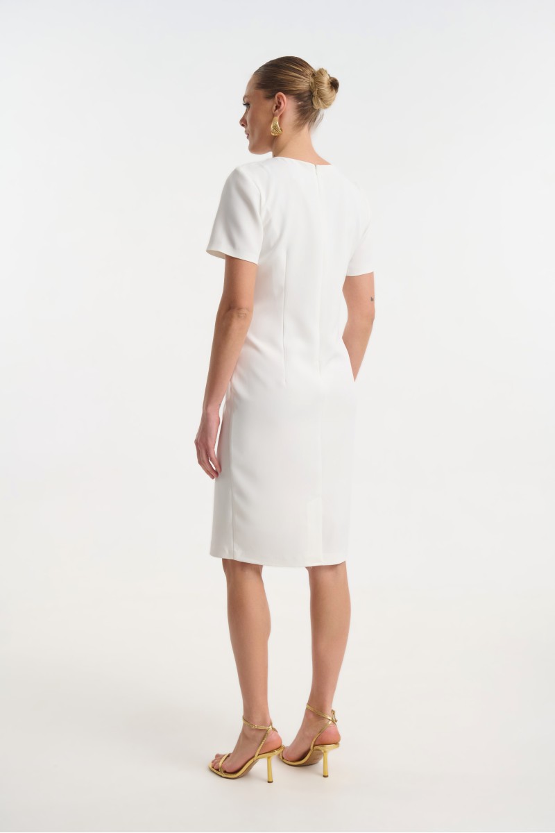 Crepe short-sleeve midi dress with a back slit at the lower part, a round neckline with a decorative gold button, a back zipper closure, and a lined interior.