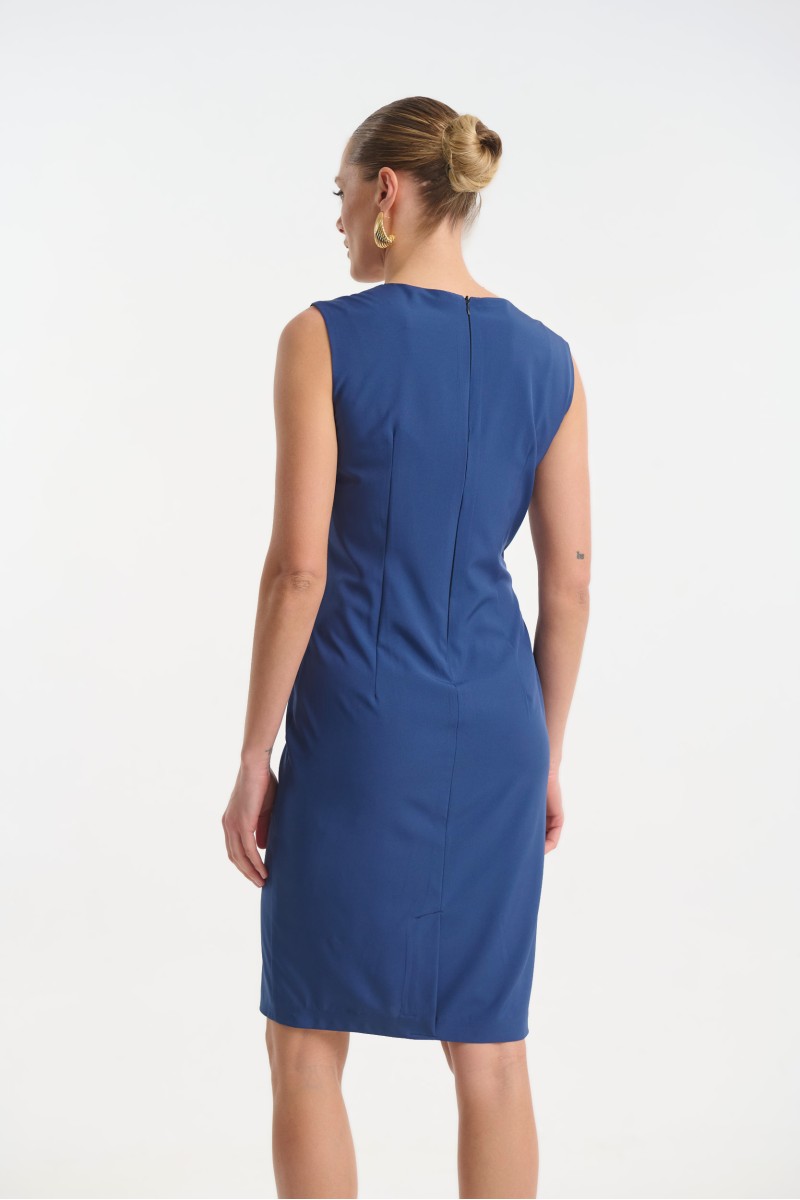 Midi wrap crepe dress with decorative gold buttons at the waist, it fastens at the back with a zipper and features a back slit at the lower hem.