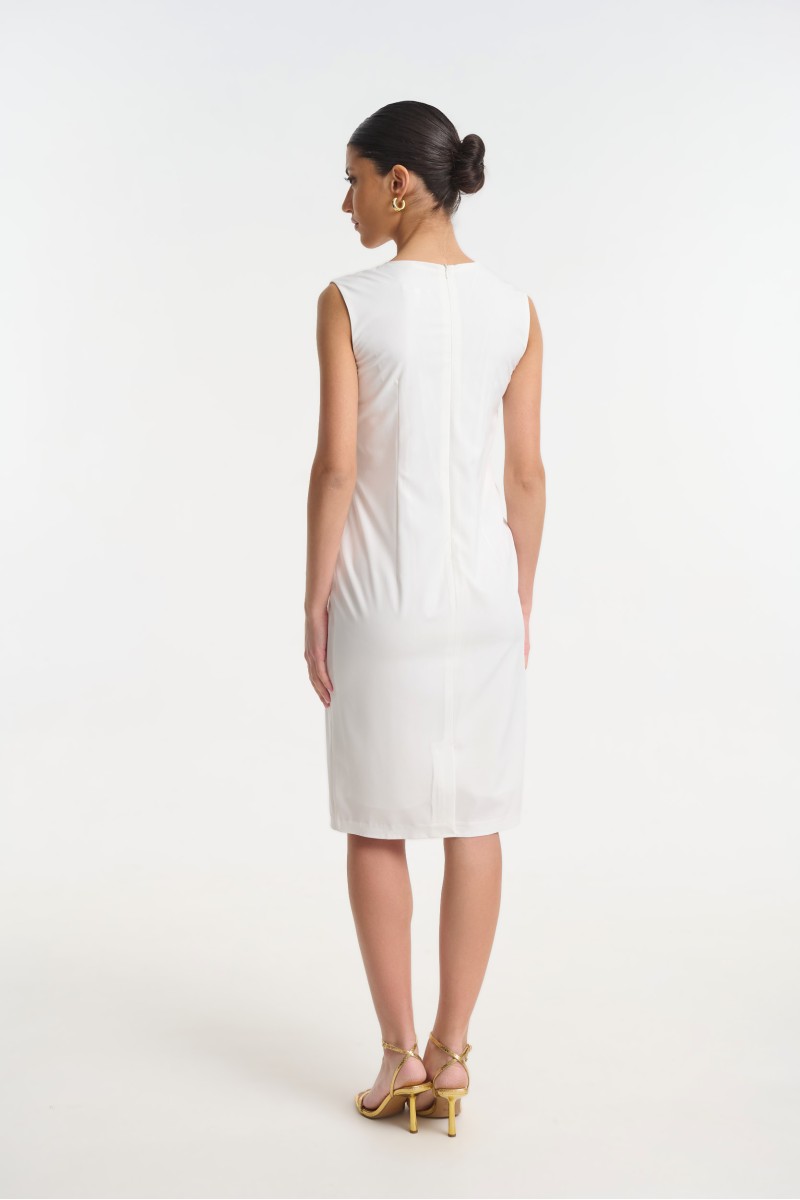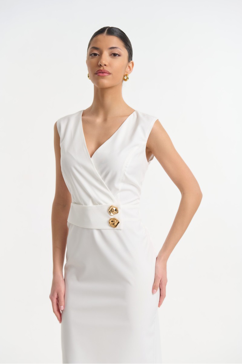 Midi wrap crepe dress with decorative gold buttons at the waist, it fastens at the back with a zipper and features a back slit at the lower hem.