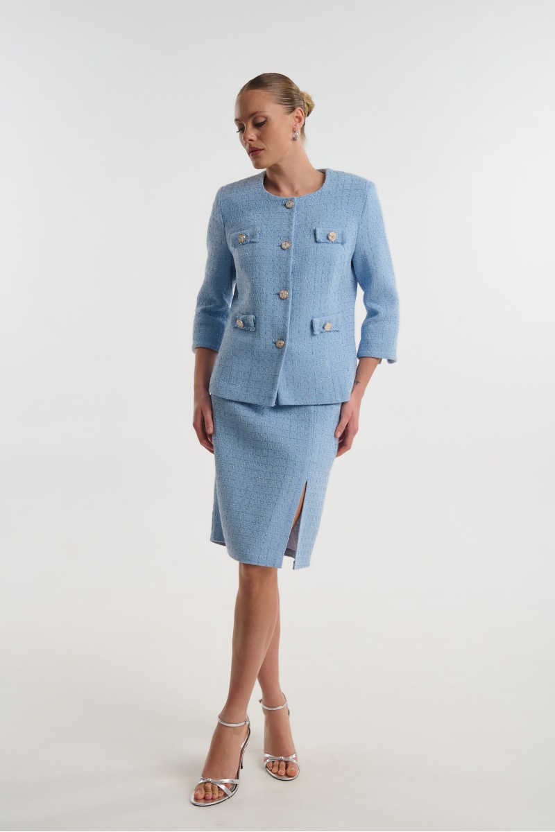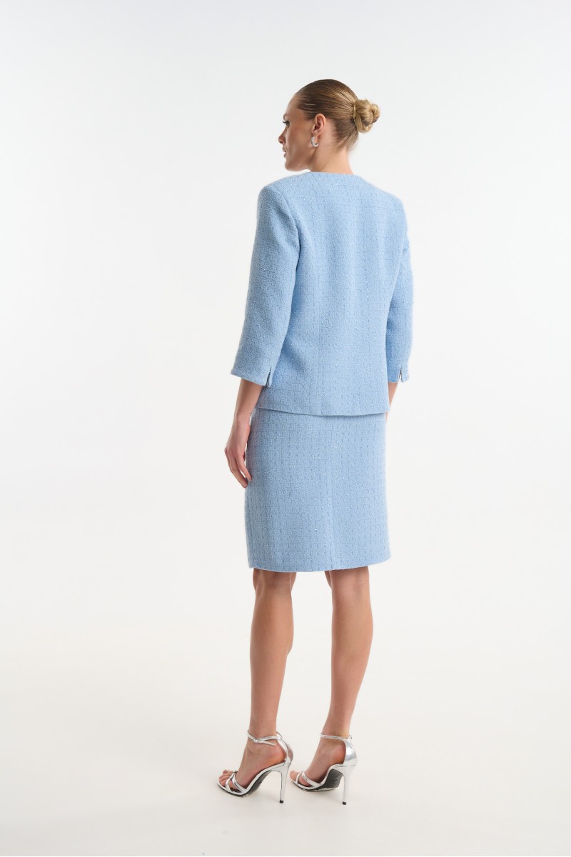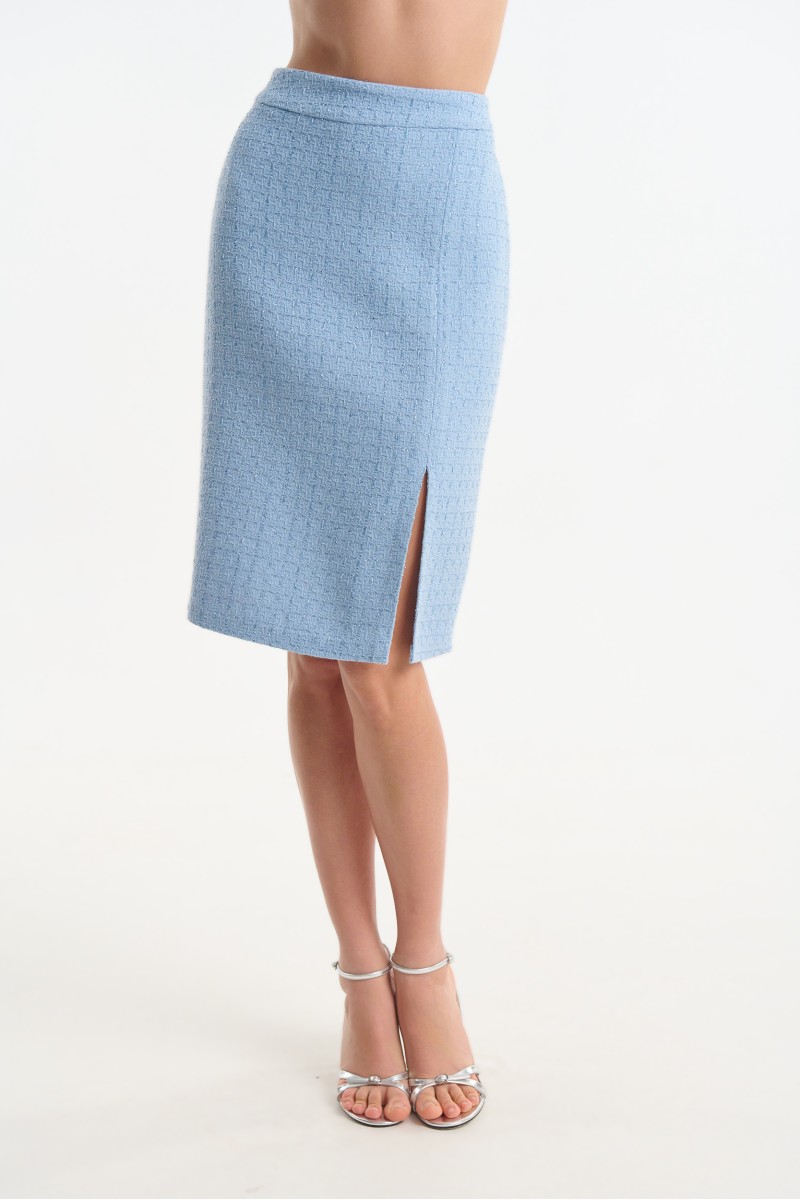 High-waisted midi skirt with lurex, bottom slit, back zipper closure, lined.