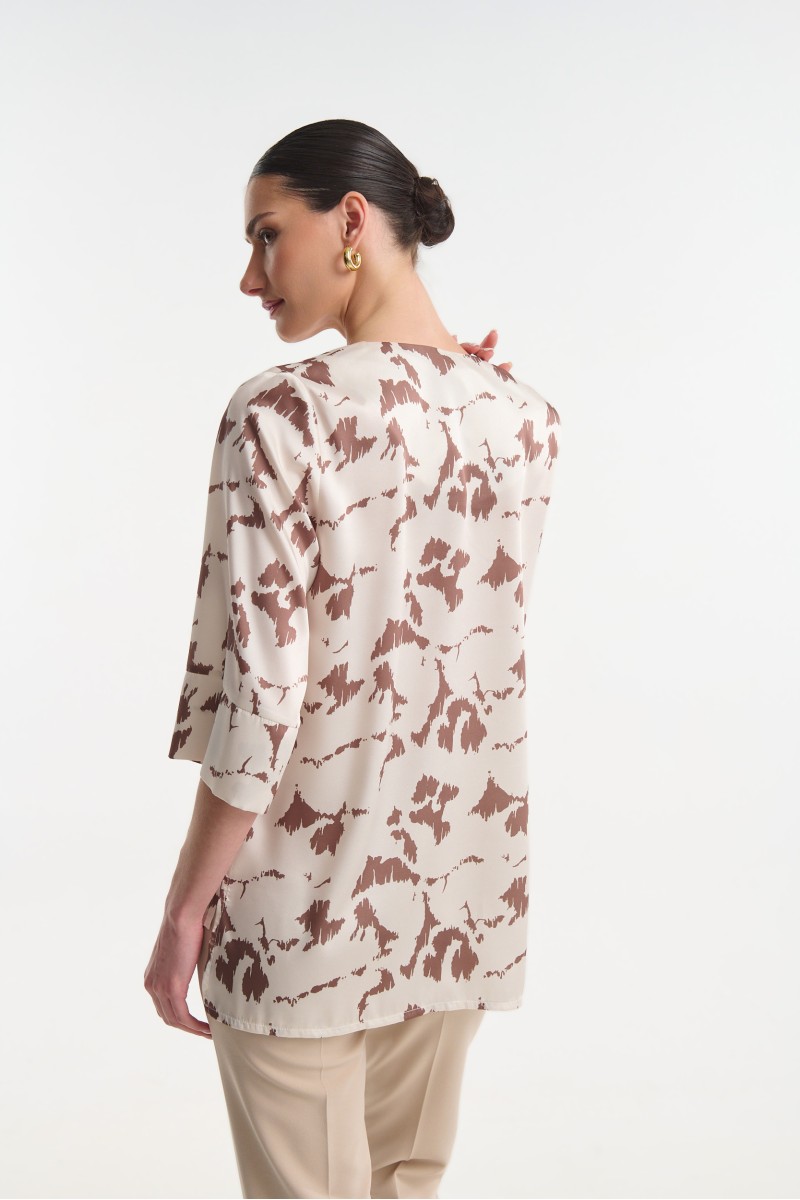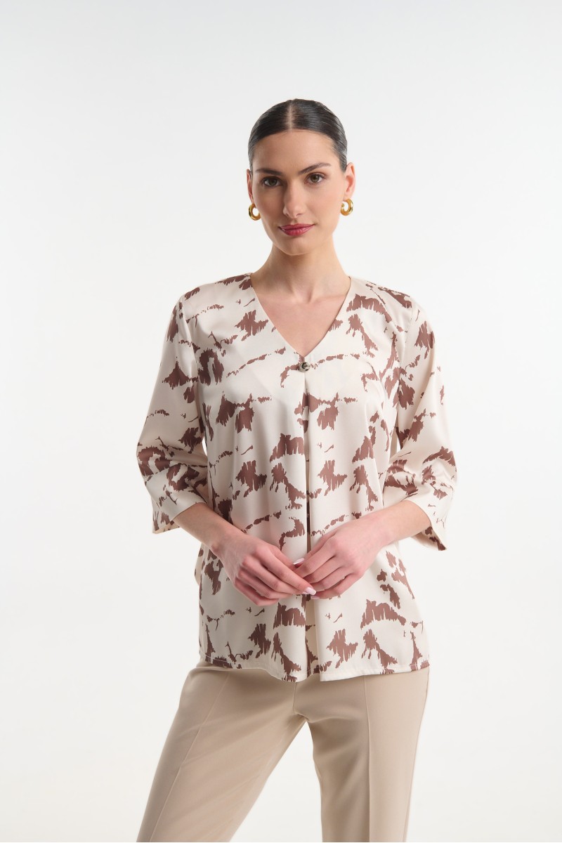 Printed blouse with 3/4 sleeves and a decorative button at the neckline, satin-like texture, featuring a relaxed fit.