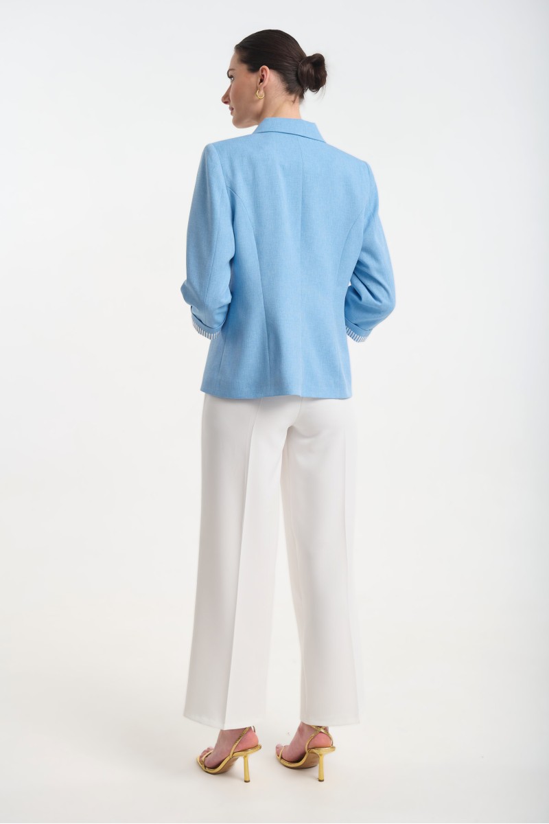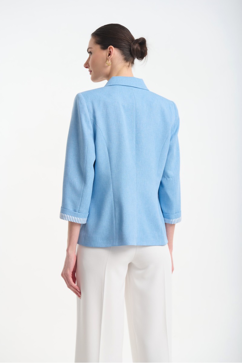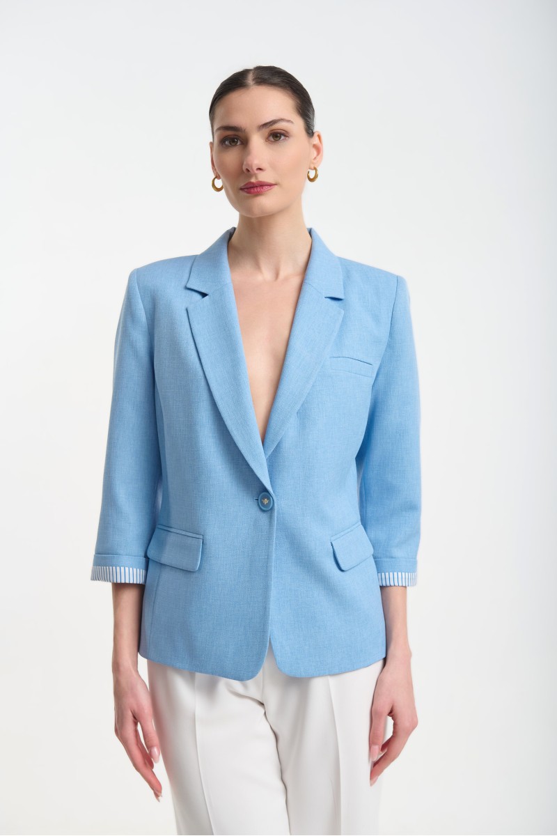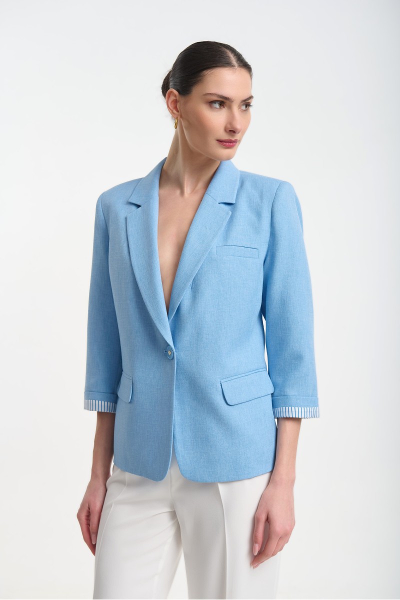 Linen blazer with lapel collar, front button closure, decorative pockets, and ? sleeves with rolled cuffs. It is lined for added comfort.