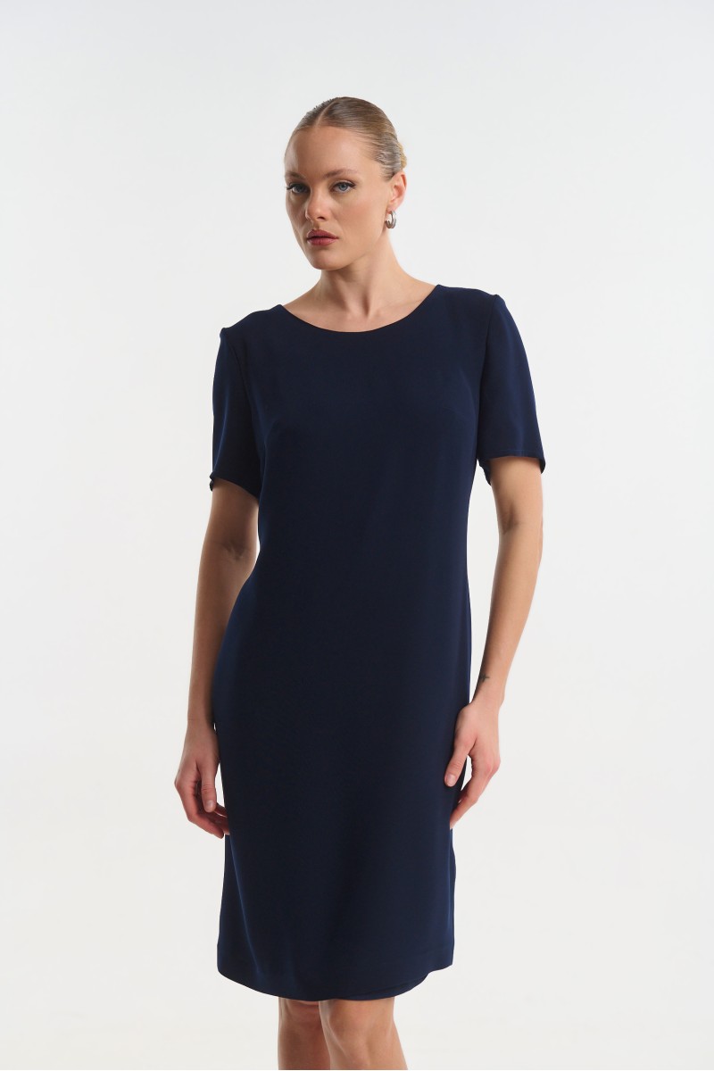 Midi short-sleeve dress set with jacket. The dress features a round neckline, fastens at the back with a zipper, and has a small slit at the bottom. The jacket has decorative rhinestones on the front, 3/4 sleeves, and closes with a hook fastening.