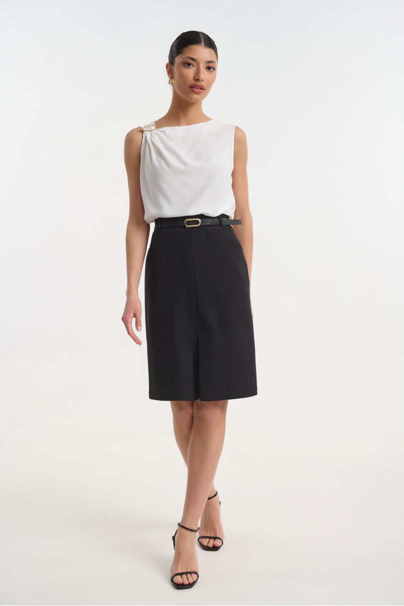 Midi high-waisted crepe skirt with a front slit at the hem, closes at the back with a zipper and includes a belt for an even better fit.