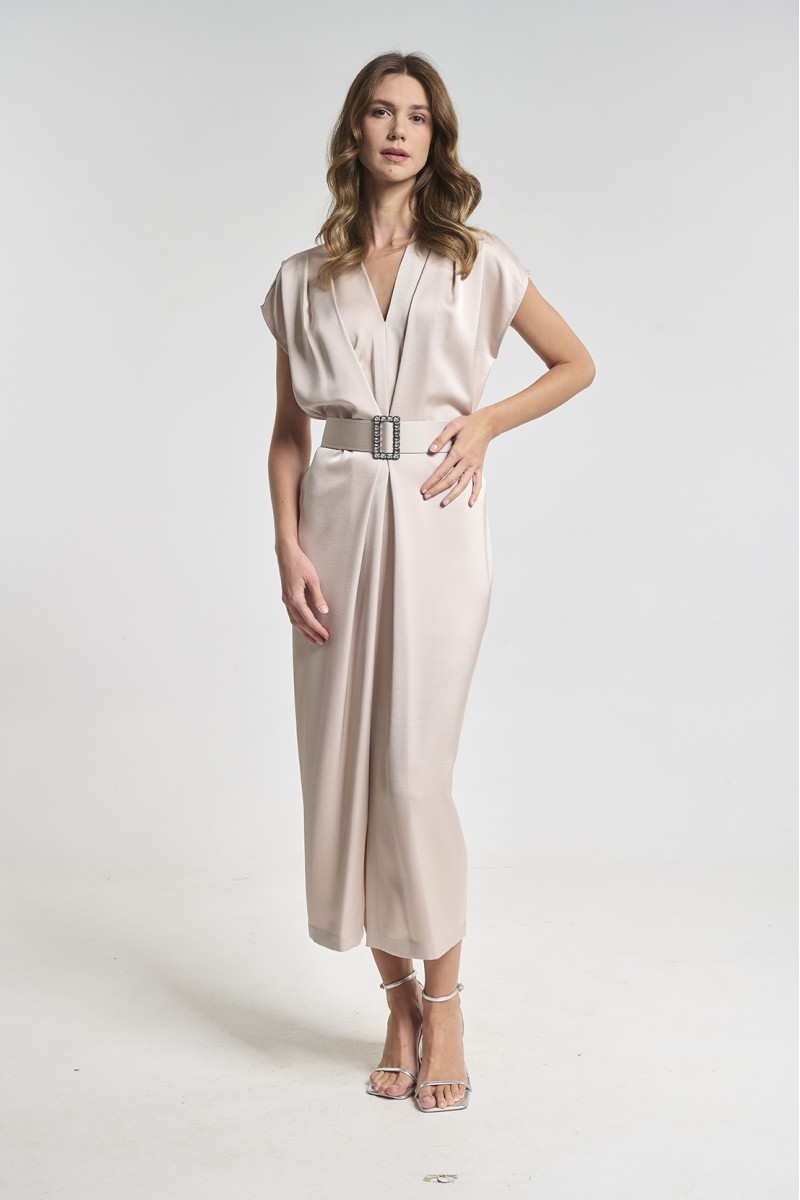 Satin long dress with short sleeves, featuring a detachable belt with rhinestones.