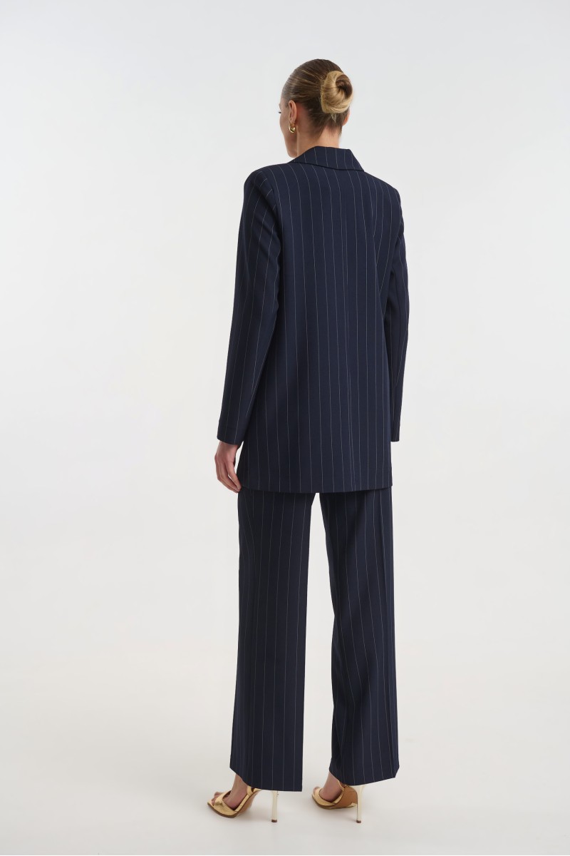 High-waisted striped trousers with a front zipper and button closure, featuring belt loops and front pockets.