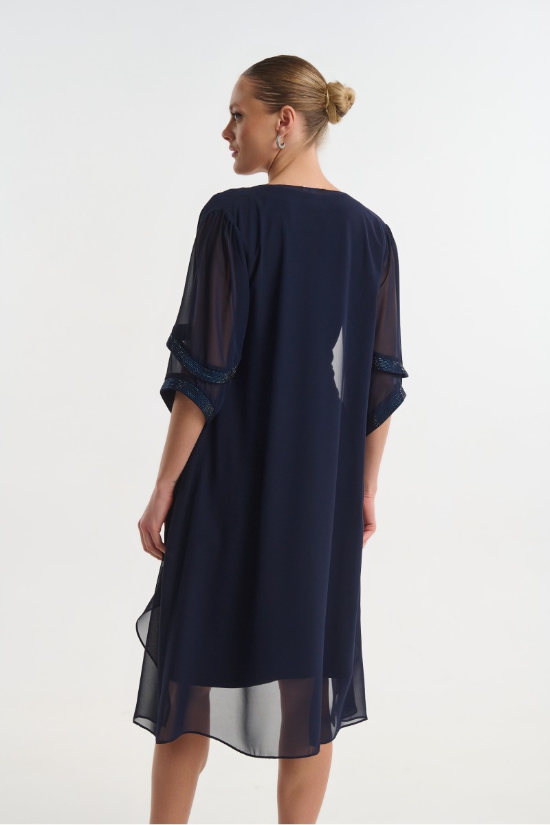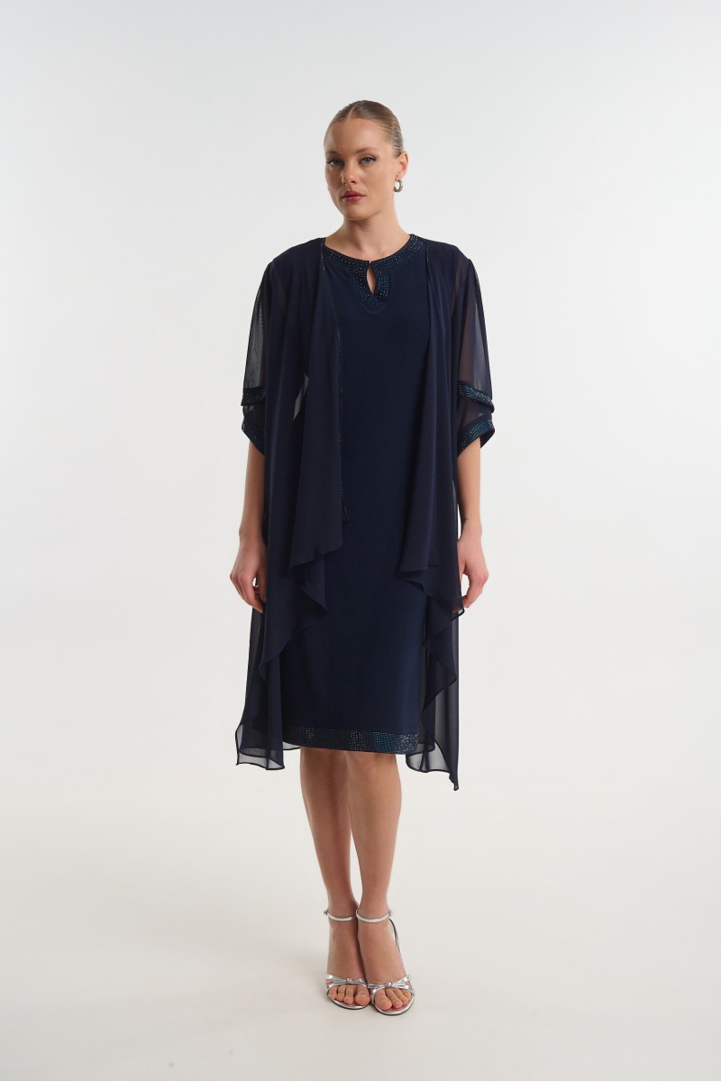 Jersey stretch dress with rhinestone embellishments on the neckline and hem, paired with a chiffon jacket featuring 3/4 sleeves and rhinestones.