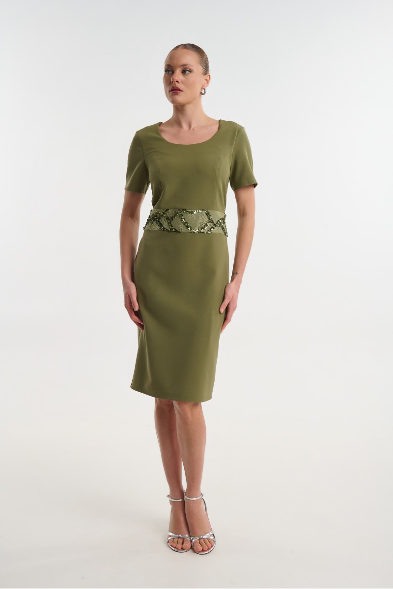Two-piece set featuring a crepe midi short-sleeve dress with sequin detail at the waist, a back zip closure, and a lace sequin jacket with front hook-and-eye fastening.