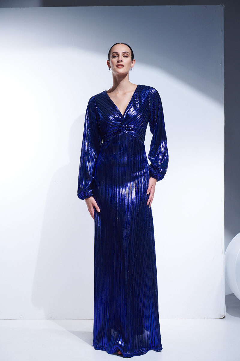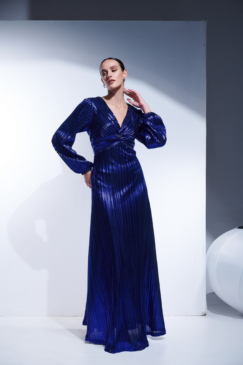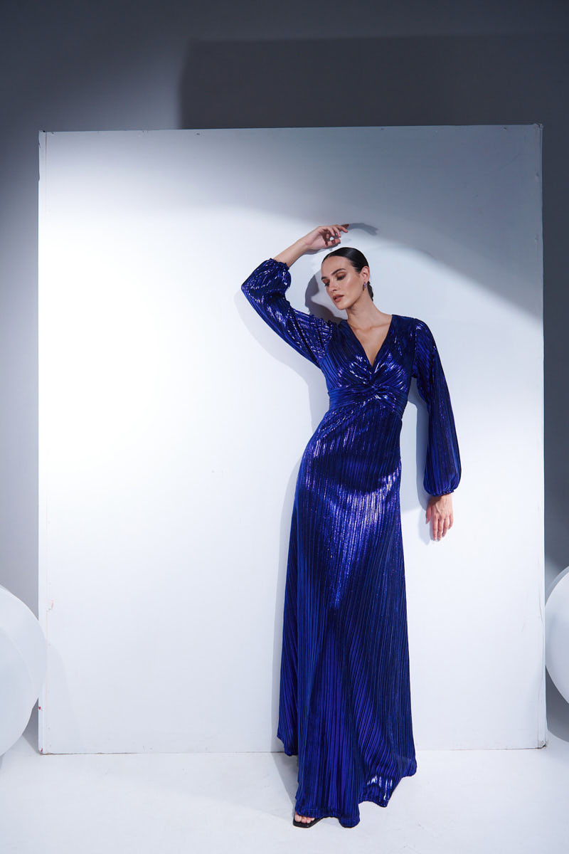 Μακρύ μεταλλιζέ φόρεμα, V άνοιγμα με σούρα, μακρύ μανίκι με λάστιχο στο τελείωμα, κλείσιμο