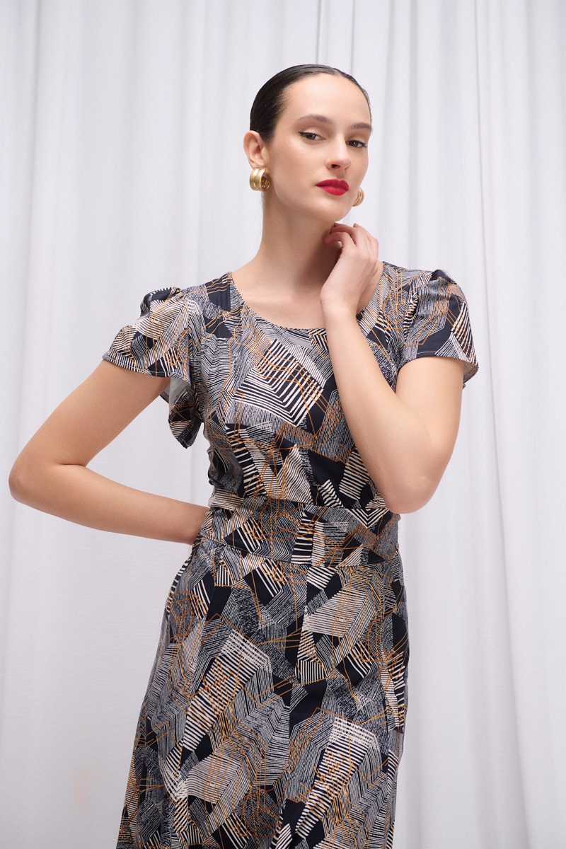 Εμπριμέ ελαστική μπλούζα, στρόγγυλη λαιμόκοψη, κοντό αέρινο μανίκι.