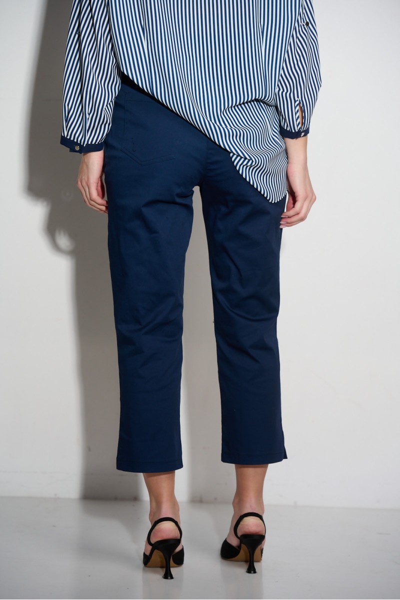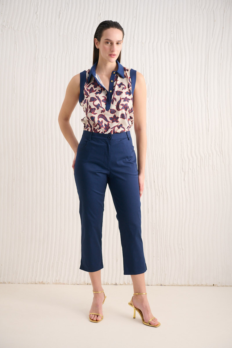 Καμπαρντινέ κάπρι παντελόνι με μικρά ανοίγματα στο τελείωμα, θυλάκια για ζώνη, τσέπες μπροστά και πίσω, κλείσιμο με φερμουάρ και κουμπί μπροστά.