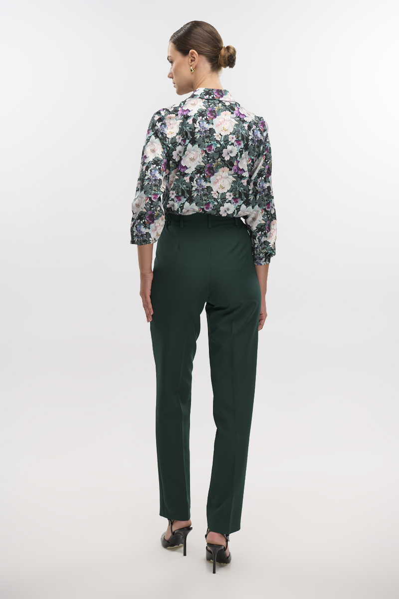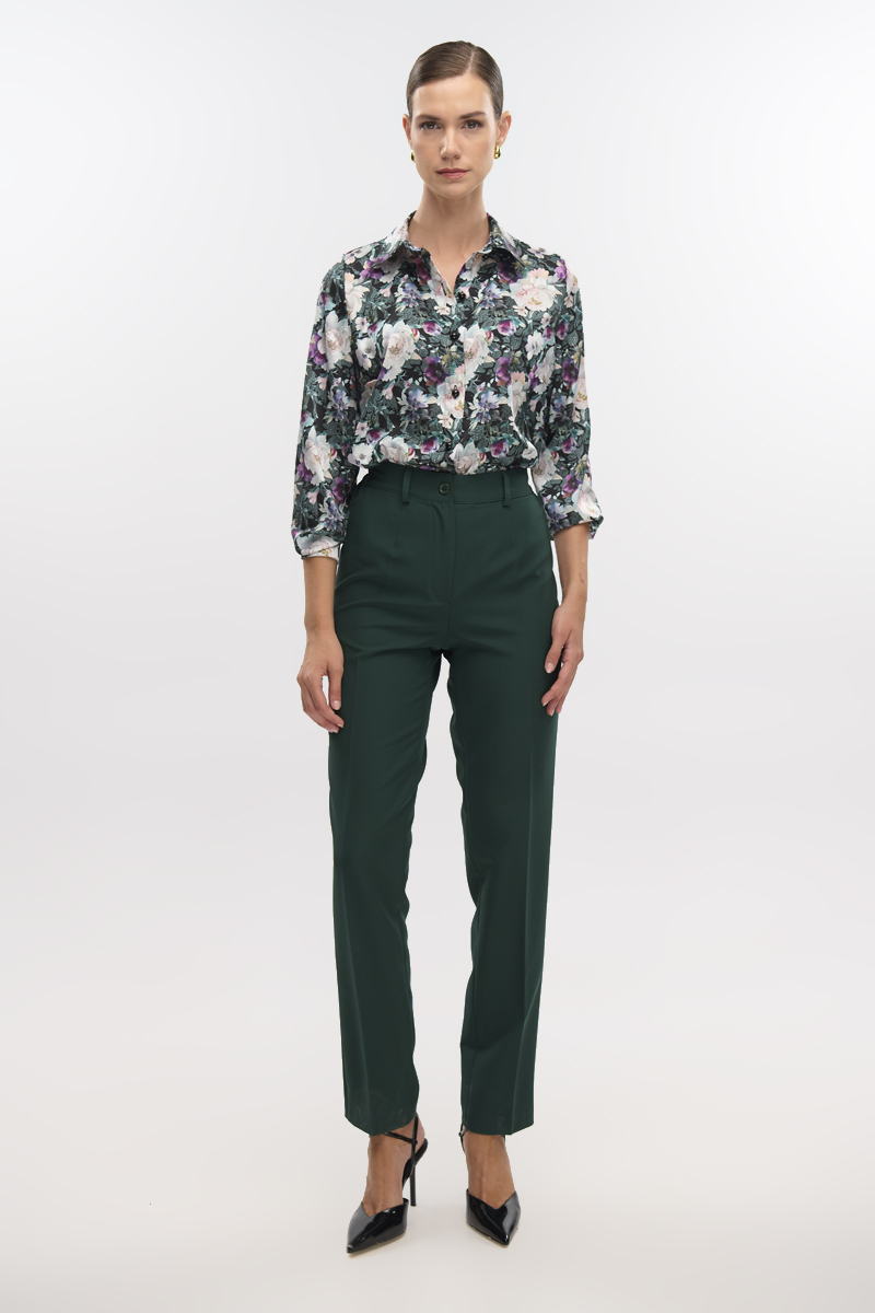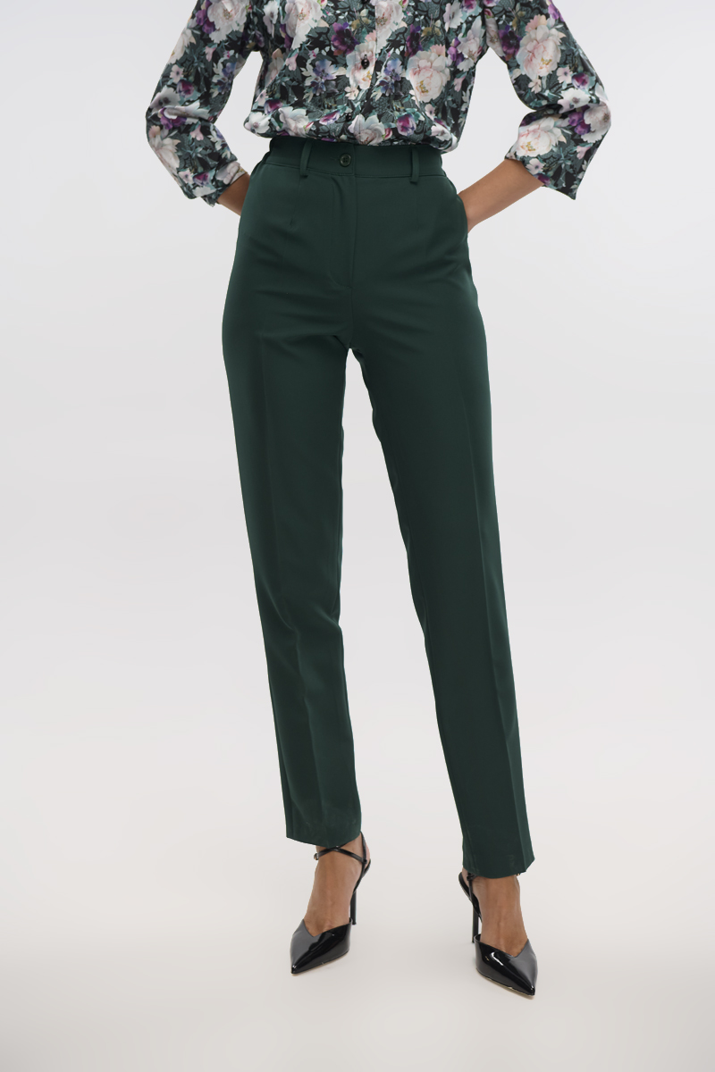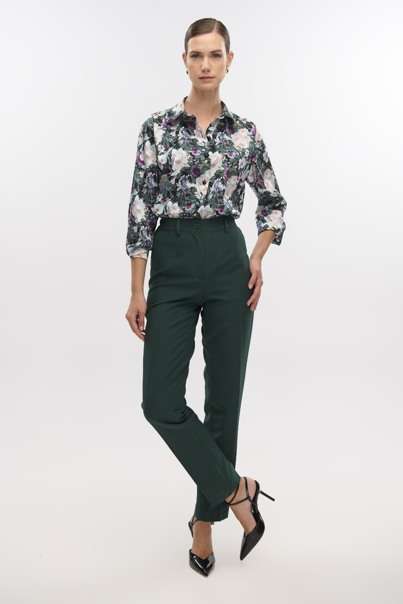 Ψηλόμεσο παντελόνι με λάστιχο στα πλαϊνά της μέσης, κλείσιμο μπροστά με φερμουάρ και κουμπί.