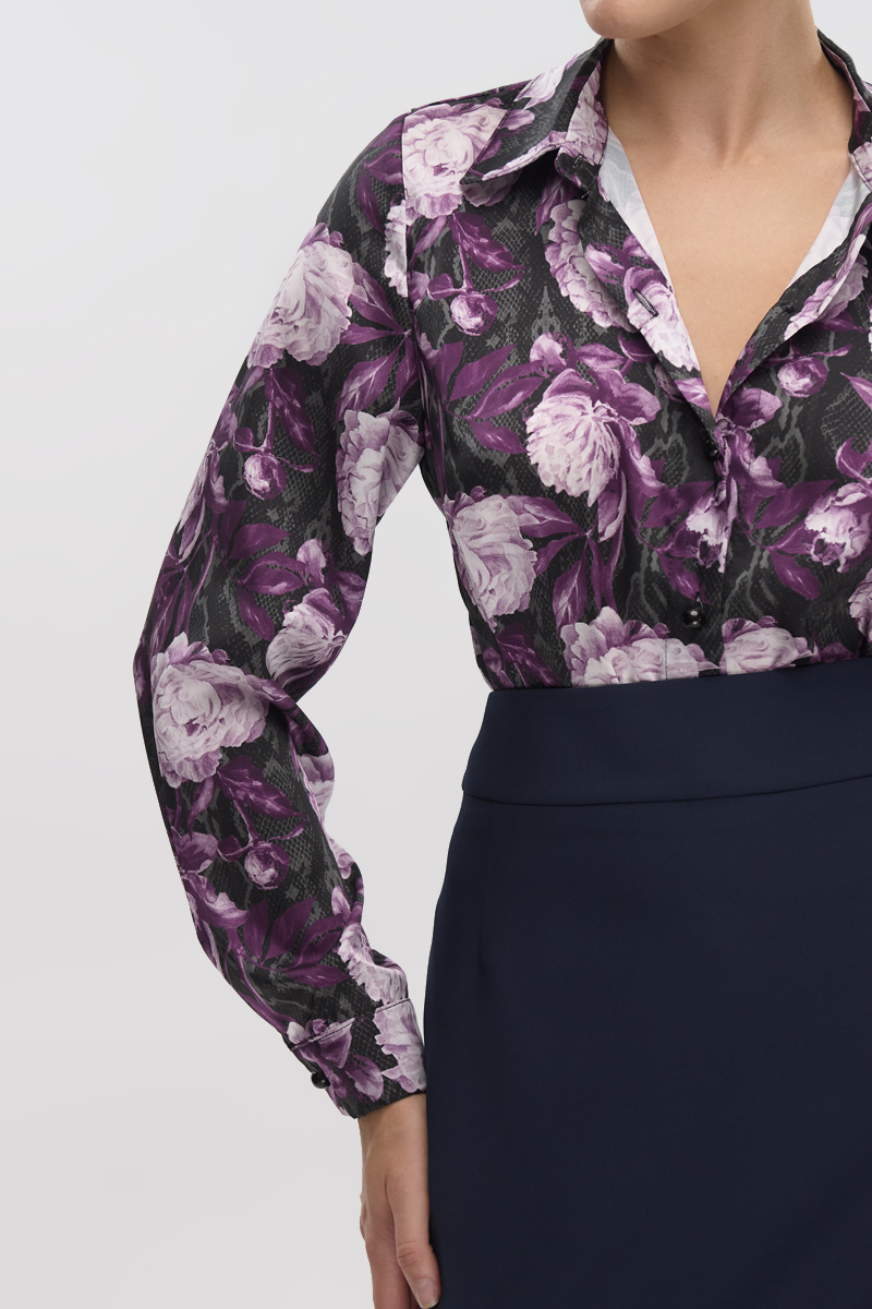 Πουκάμισο floral με σατέν υφή, μακρύ μανίκι με μανσέτα και κουμπί, κλείσιμο μπροστά με κουμπιά, φοδραρισμένο.