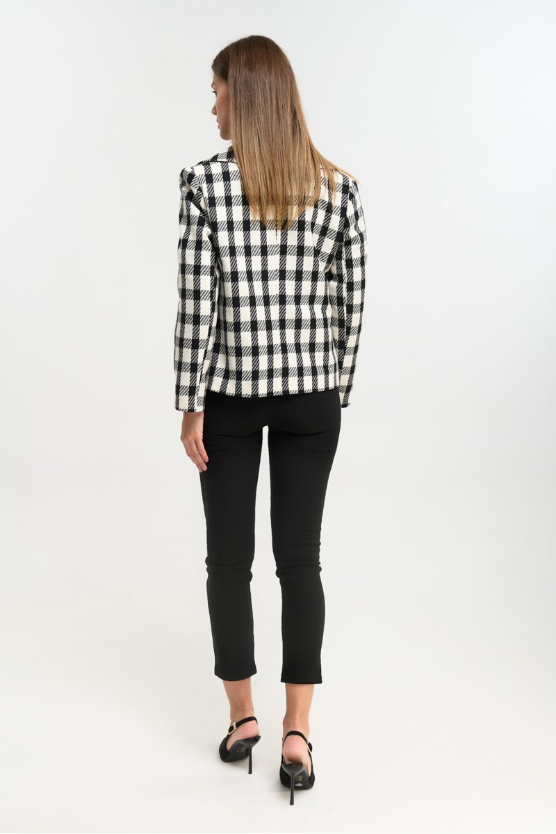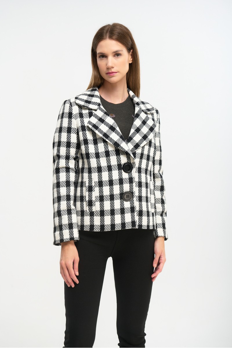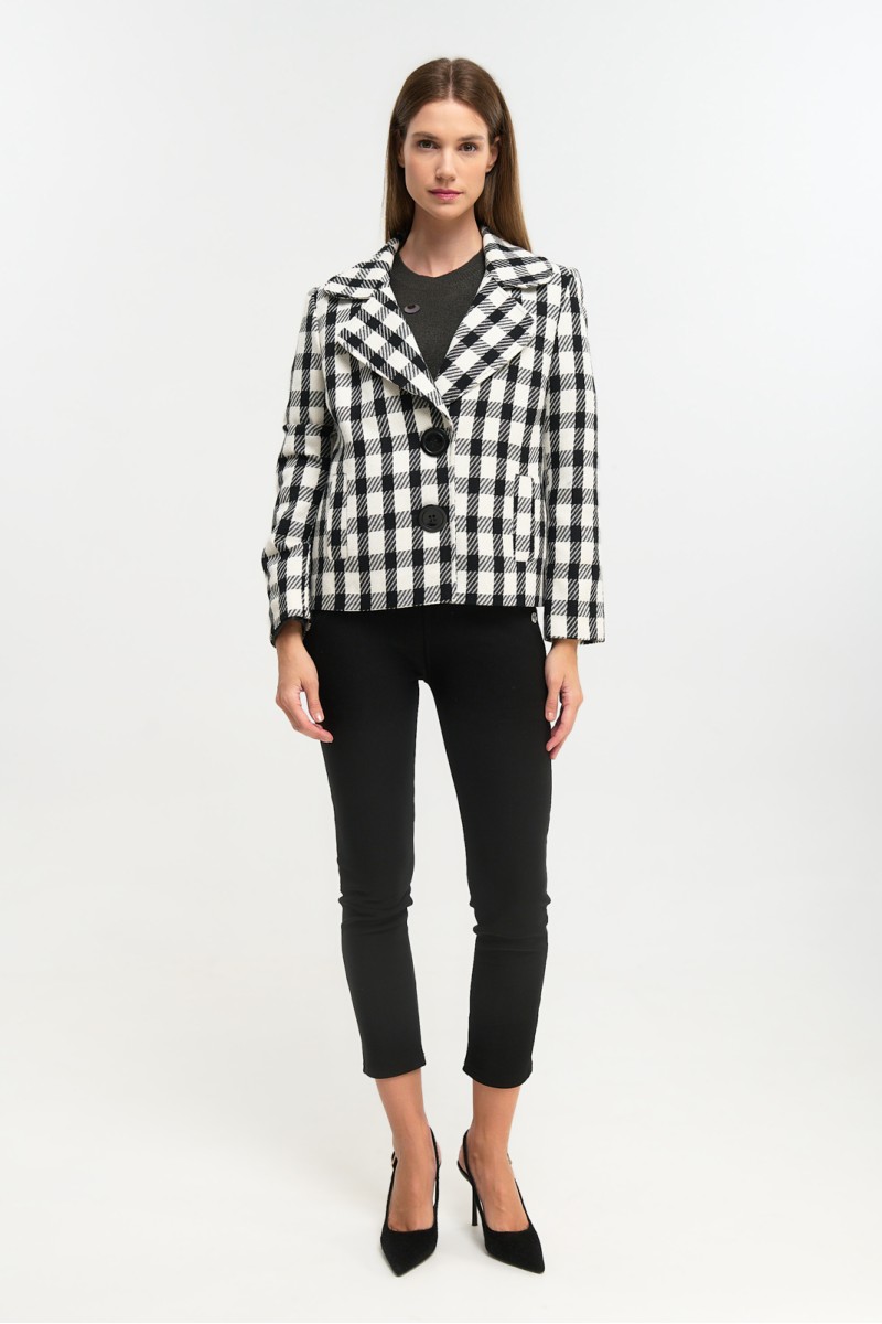 Σακάκι καρό με πέτο γιακά, βάτες στους ώμους, μακρύ μανίκι, μπροστινές τσέπες με ρέλι, κλείσιμο μπροστά με κουμπιά, φοδραρισμένο.