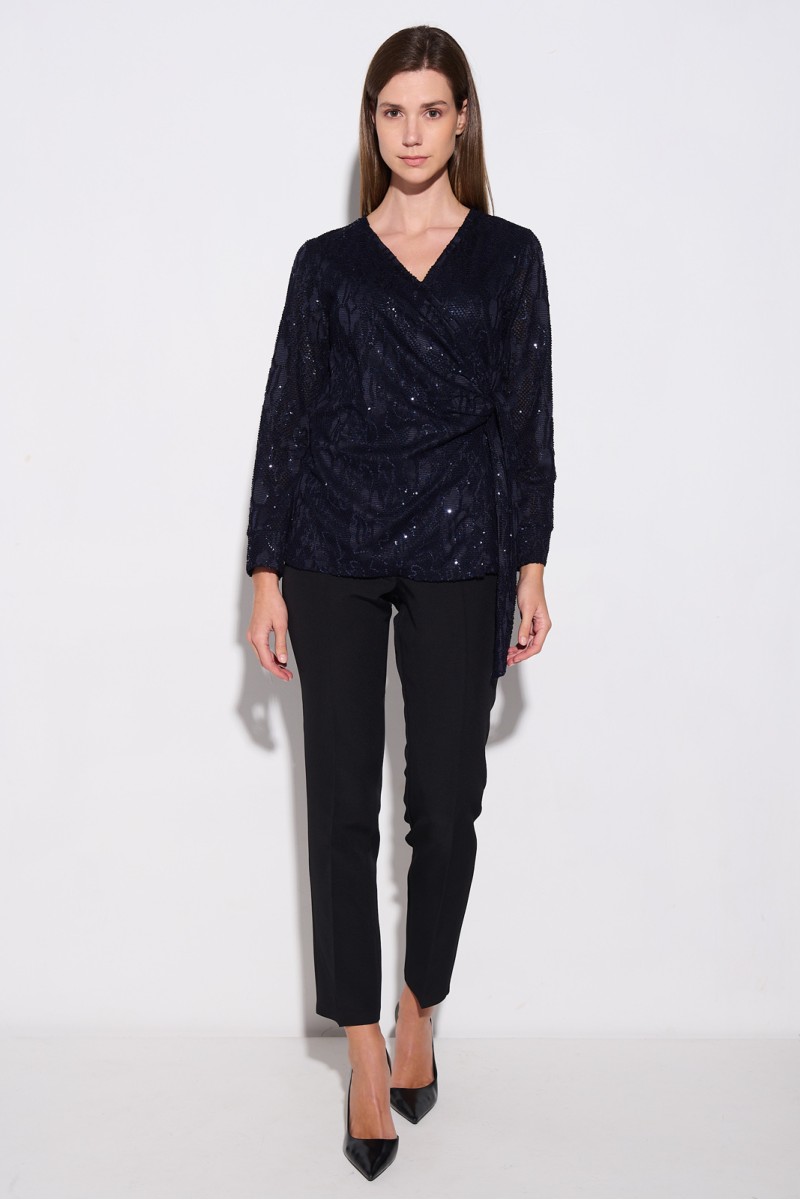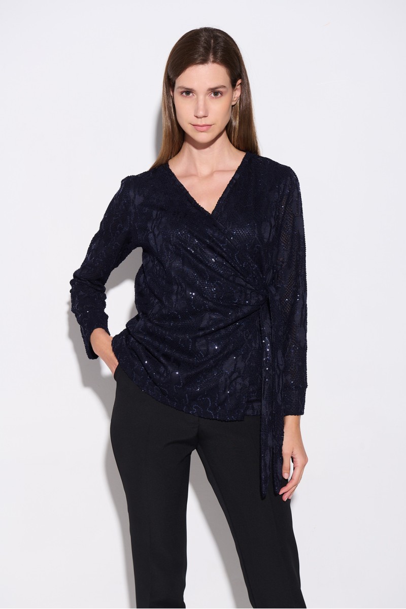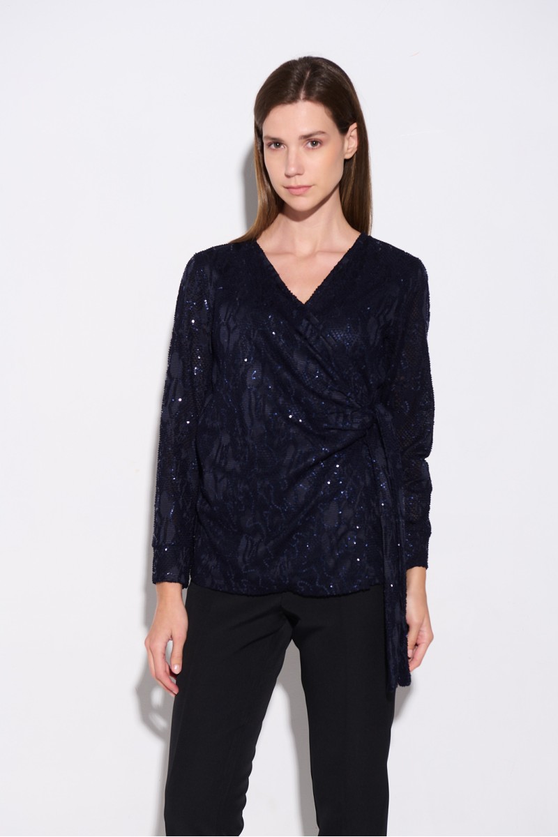 Κρουαζέ ελαστική μπλούζα με διάτρητο σχέδιο και παγιέτα, δέσιμο στο πλάι, μακρύ μανίκι, φοδραρισμένη.