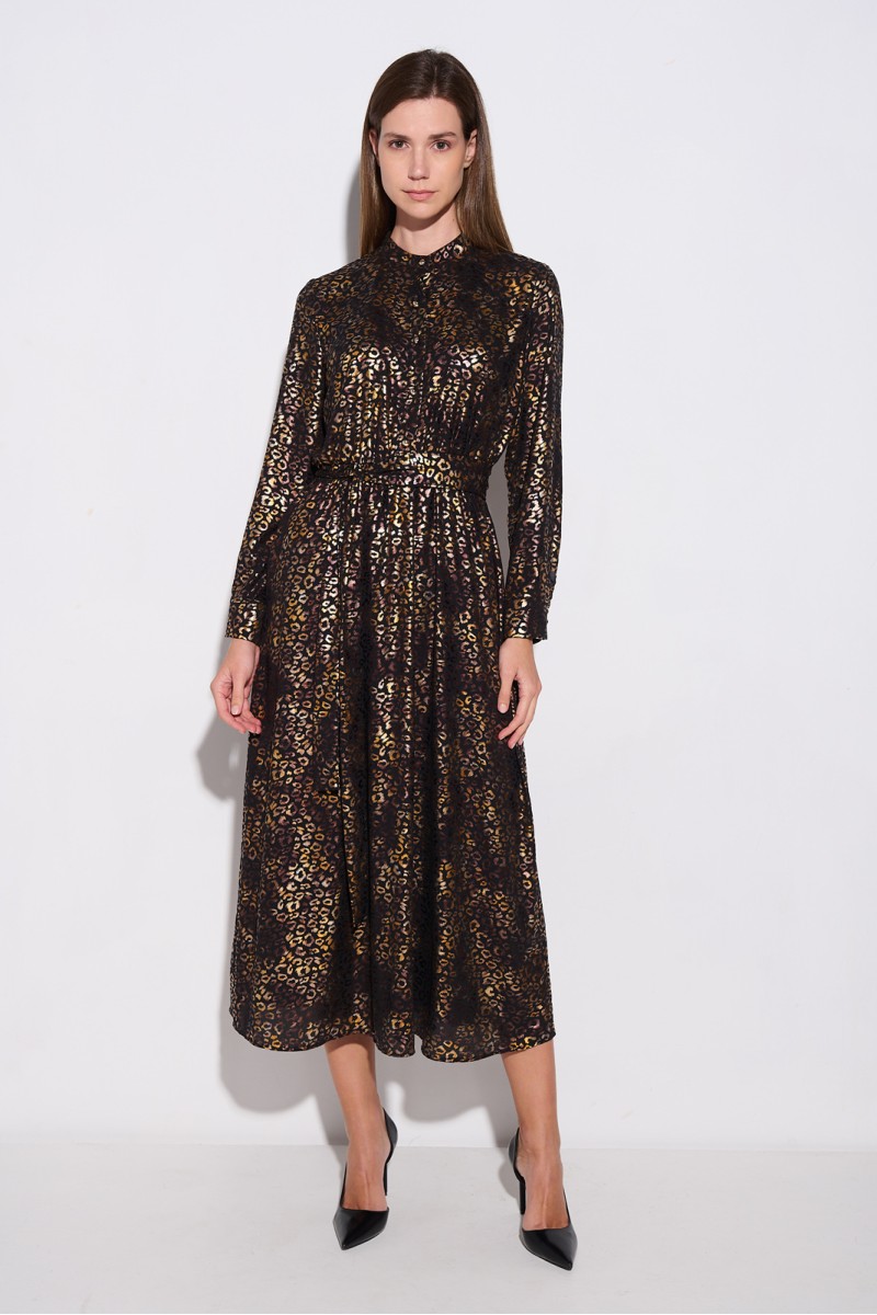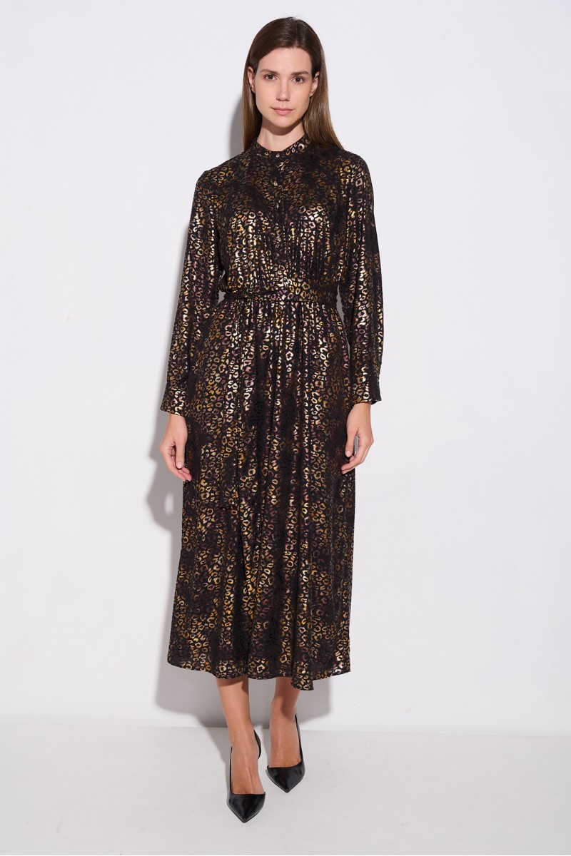 Μακρύ φόρεμα με χρυσές λεπτομέρειες, γιακάς και κουμπιά στο πάνω μέρος, μακρύ μανίκι με μανσέτα και κουμπιά στο τελείωμα, ελαστική μέση, αποσπώμενη ζώνη από το ίδιο ύφασμα, φοδραρισμένο για καλύτερη εφαρμογή.