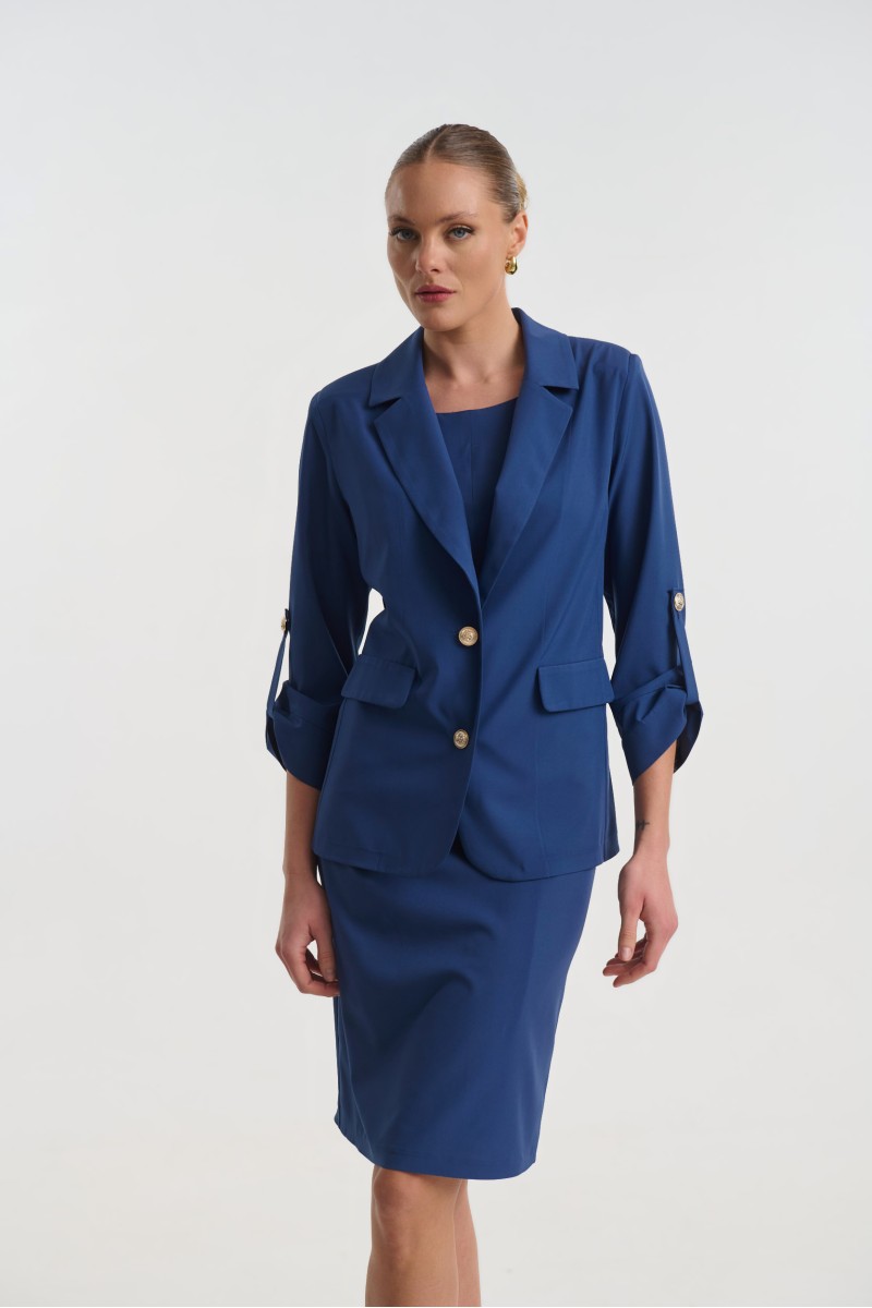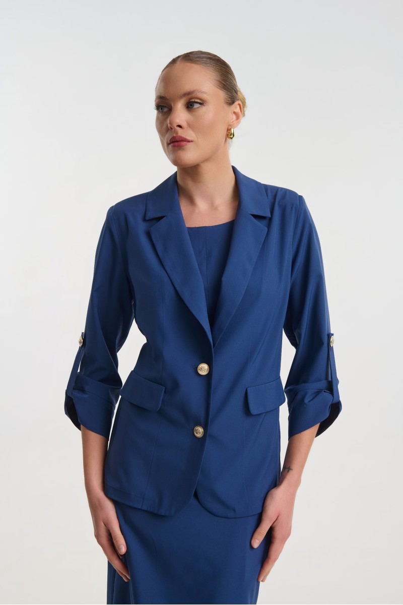 Ελαφρύ κρεπ σακάκι με 3/4 μανίκι, με πέτο γιακά, διακοσμητικές τσέπες, κλείνει μπροστά με χρυσά κουμπιά . διαθέτει βάτες στους ώμους.