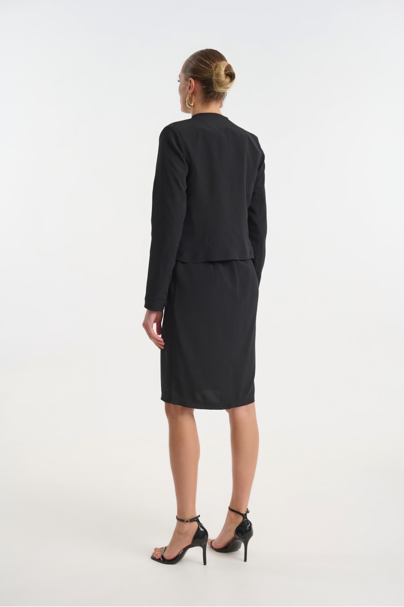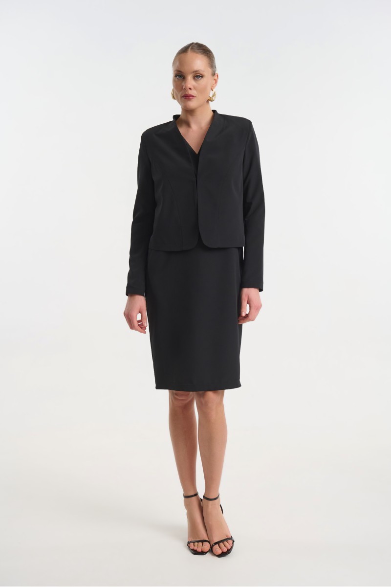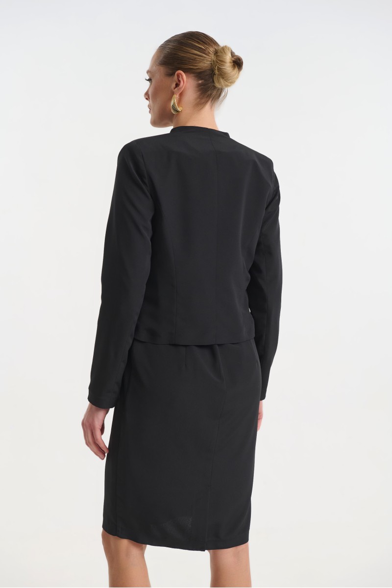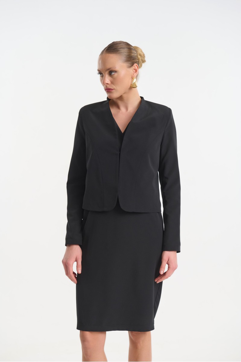 Σακάκι κοντό χωρίς πέτο, μακριά μανίκια, βάτες στους ώμους, κλείσιμο μπροστά με μεταλλική κόπιτσα, φοδραρισμένο.