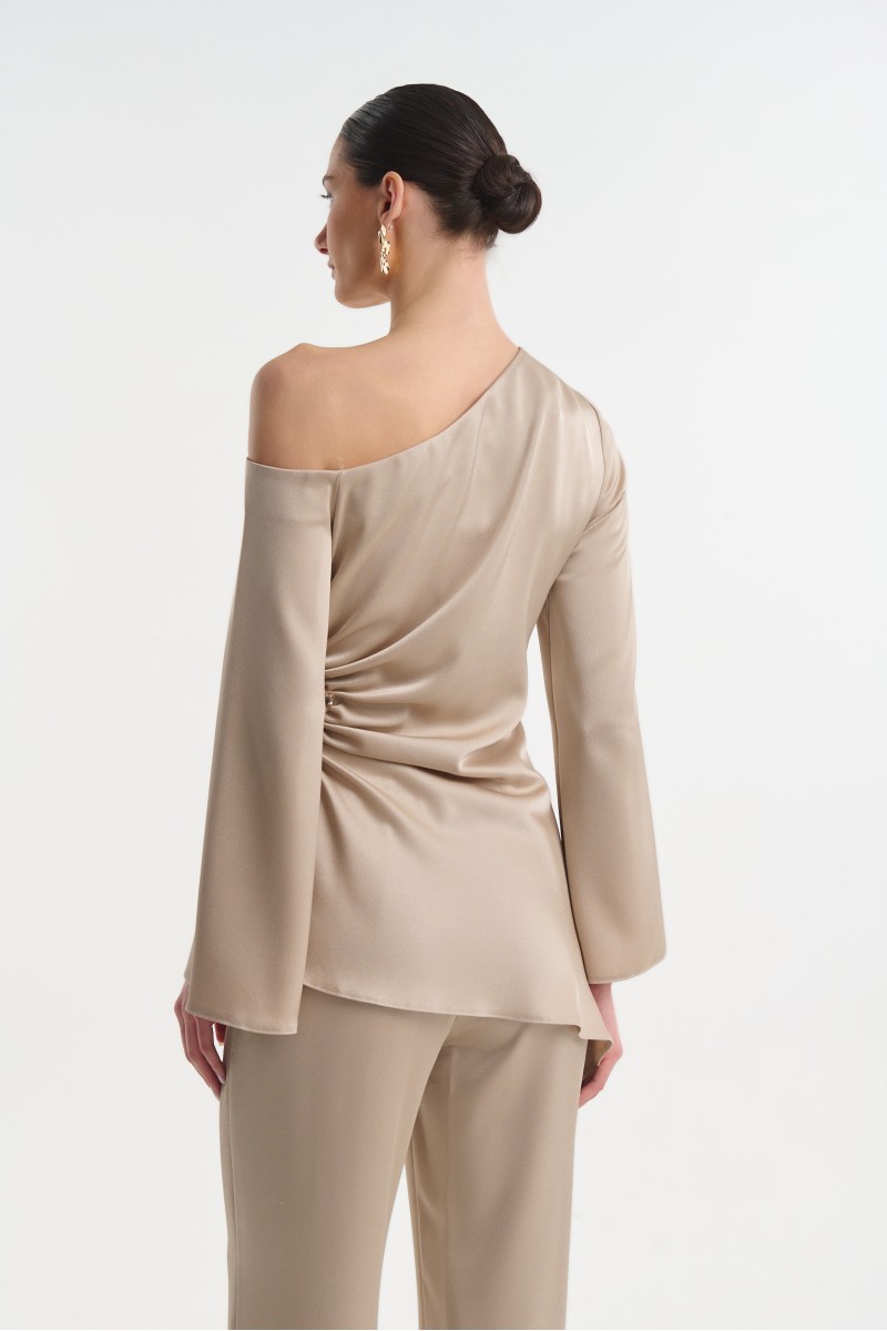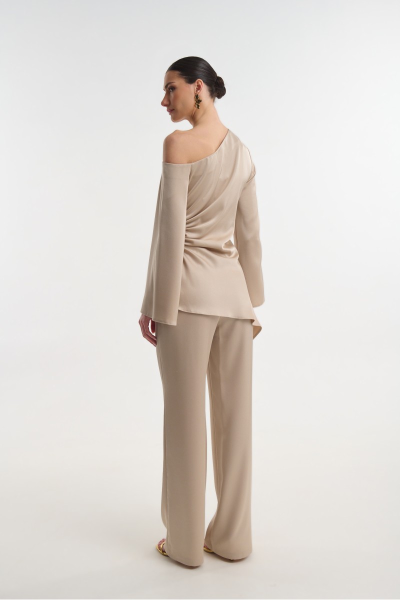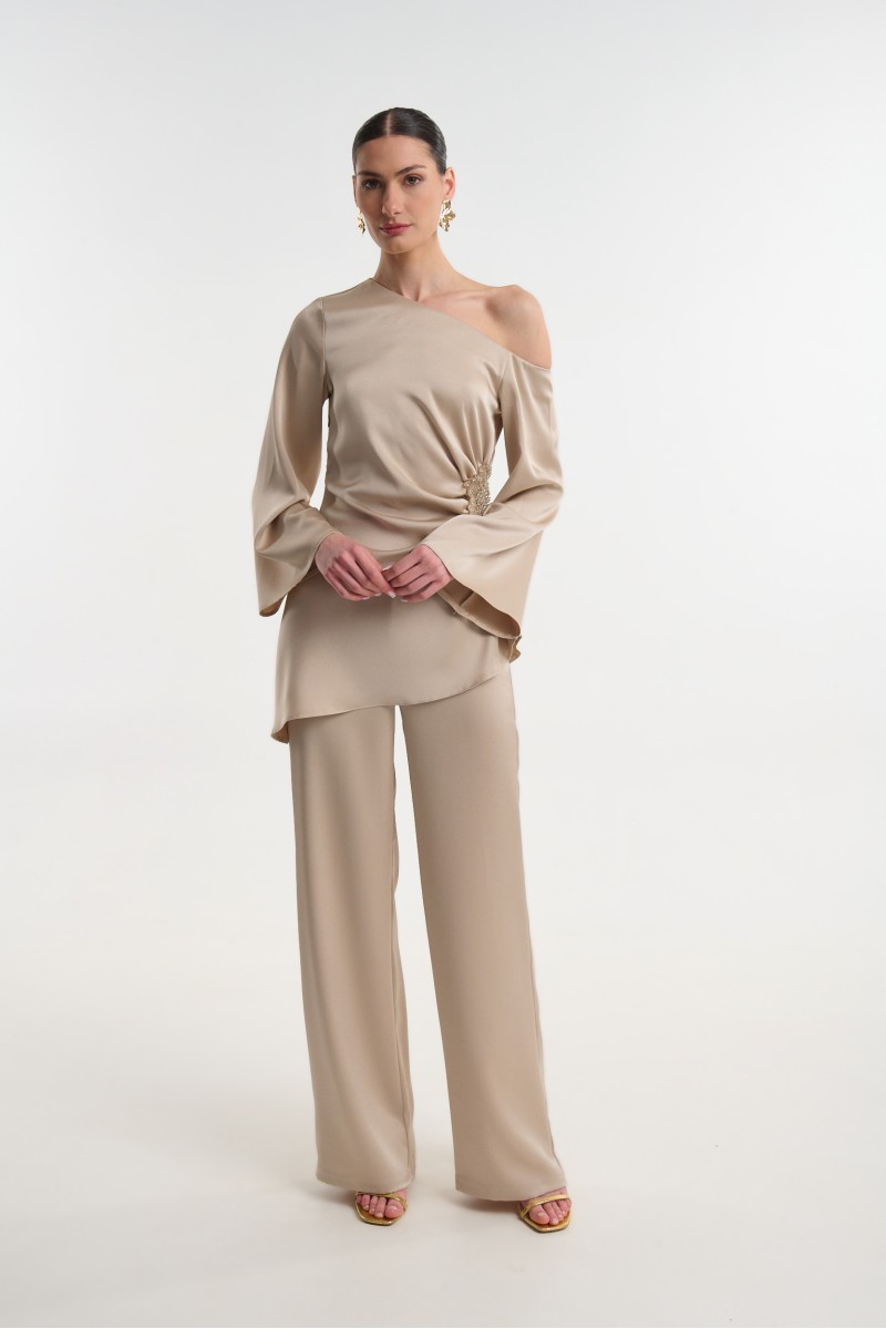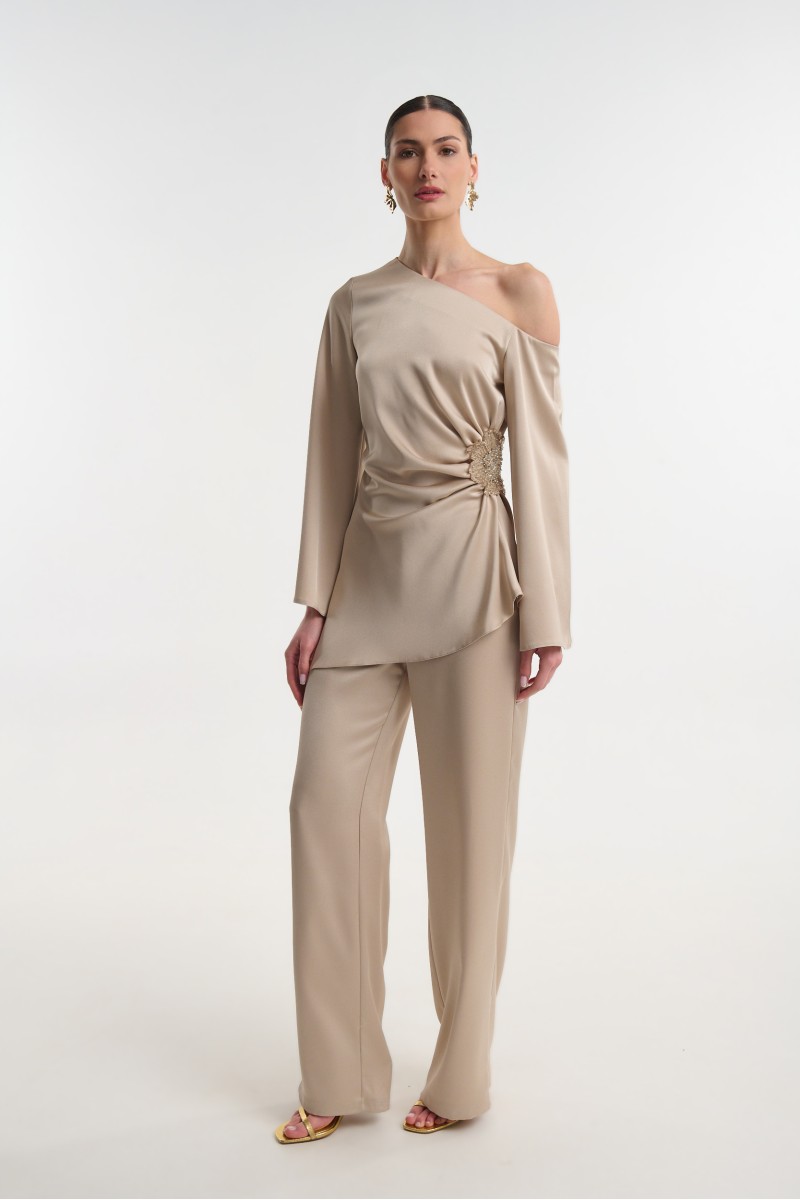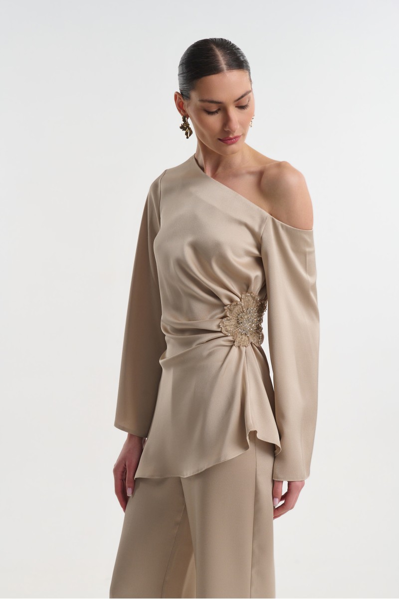 Σατεν σετ αποτελούμενο από μακρυμάνικη μπλούζα και παντελόνα με λάστιχο και μπροστινές τσέπες, η μπλούζα είναι έξωμη από τη μία πλευρά και διαθέτει διακοσμητικό λουλούδι με στρας μπροστά και πλάγια στη μέση.